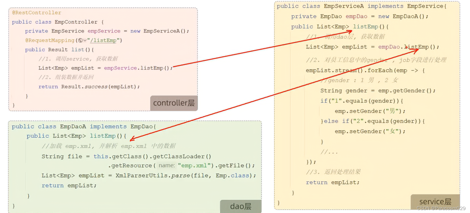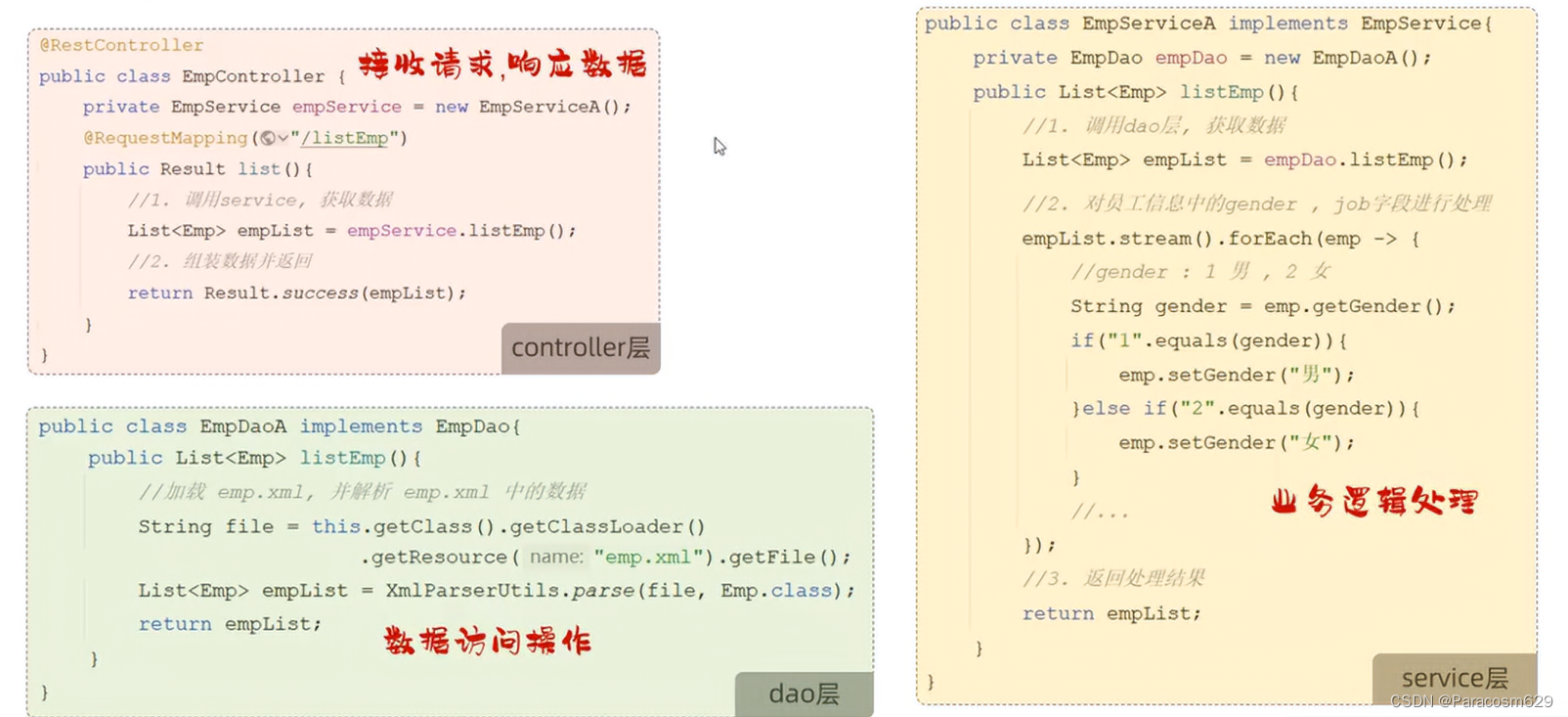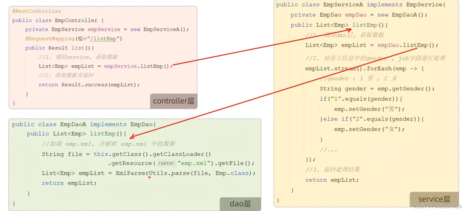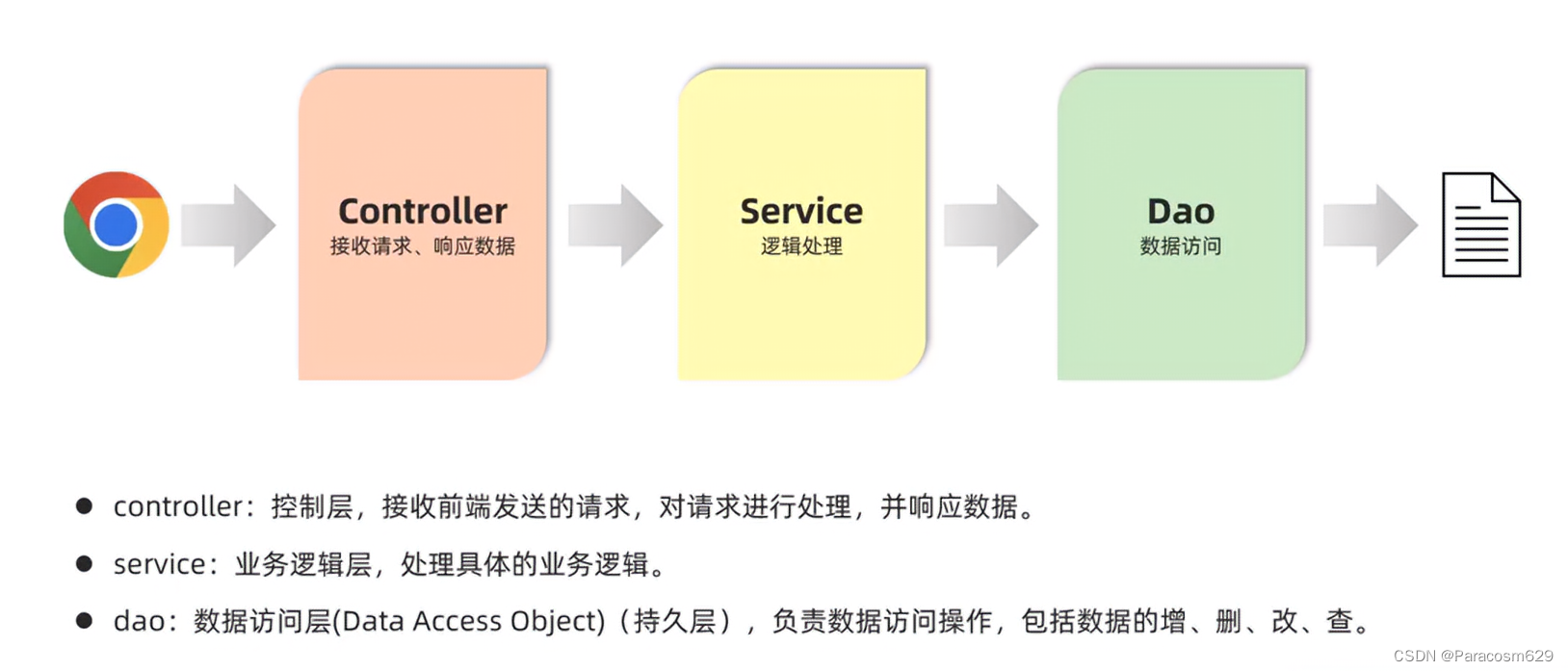 三层架构架构指的就是Controller层(用来接收请求,响应数据)、Service层(用来逻辑处理)、Dao层(用来数据访问),那么浏览器发送请求时,会先经过Controller层来接收请求,通过Service层调用Dao层进行数据访问,将文件中的信息进行解析后,返回给Service层来进行逻辑的处理,然后返回给Controller层来对浏览器进行响应。