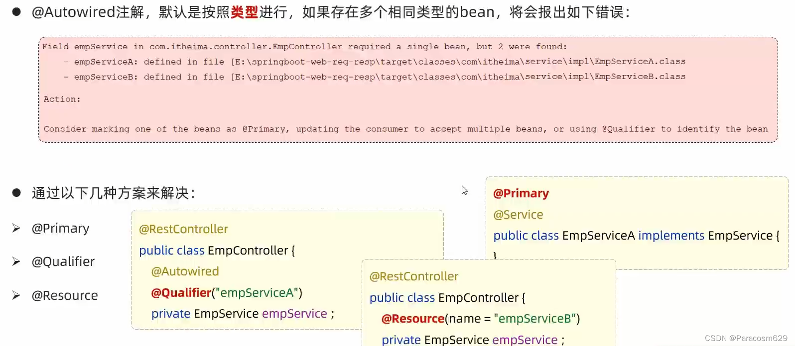 @Qualifier 需要在@Autowired的下面注释一下所需要的bean对象,默认的bean对象名是类名首字母小写,例如 @Qualifier(“empServiceA”),就代表实现EmpServiceA的bean对象