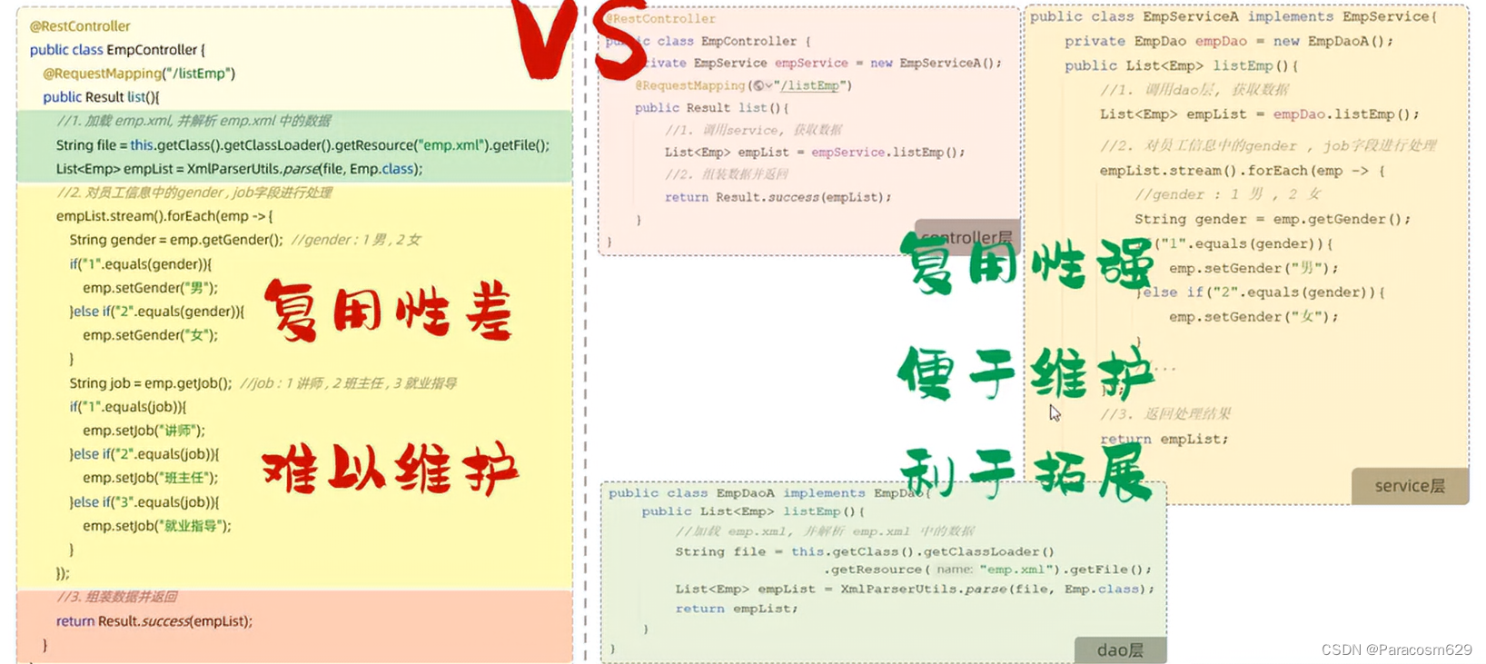 拆分前后对比,之前将代码全部写到了一起,代码逻辑混乱,复用性差、难以维护。拆分之后,代码逻辑强,代码各司其职,只处理需要的请求,利于我们后面迭代的维护,拓展。