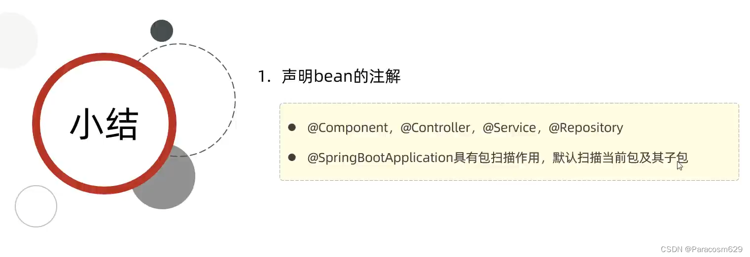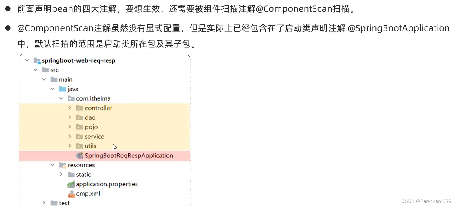 那么对于这些注释声明过的模块层,还要注意要用@ComponentScan来扫描包下的注释,如果要扫描的包都在springbootapplication启动项的包内,默认会扫描启动类所在包,以及子包,所以不需要再注释