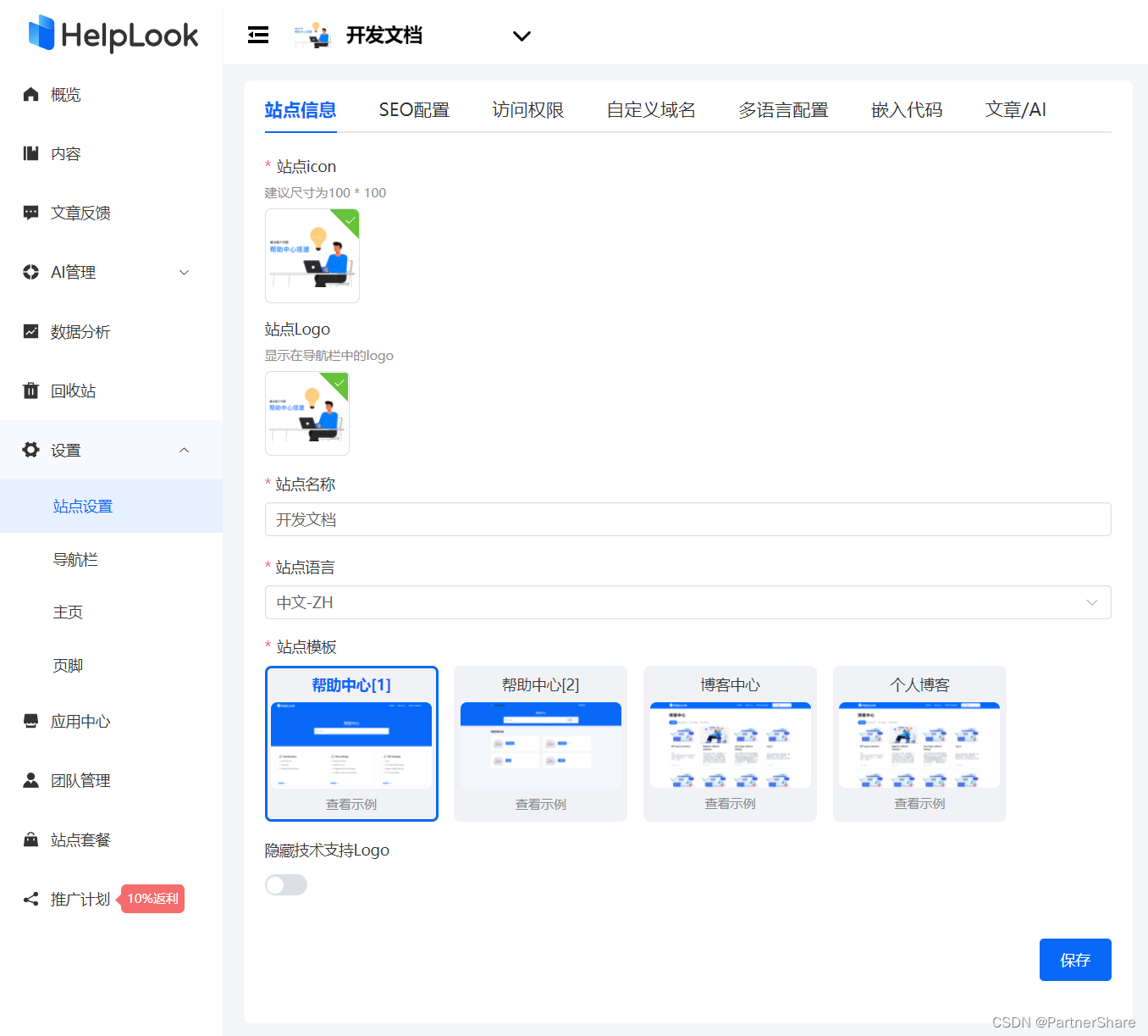 创建完基础站点信息之后,可以选择站点模板和自定义站点的基本信息,就可以在内容页面填充创建并快速迭代栏目/内容,这个环节不仅需要使用 HelpLook 创建,更多的需要我们开发团队通过不断的思考论证和缜密思考,完善出第一版稳定的文档。