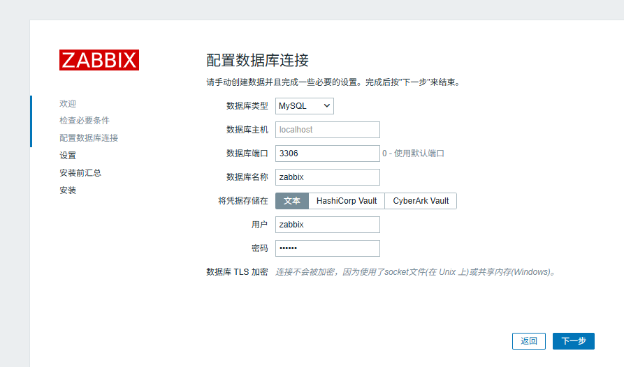 mysql CREATE DATABASE zabbix CHARACTER SET utf8mb4 COLLATE utf8mb4_bin; GRANT ALL PRIVILEGES ON zabbix.* TO 'zabbix'@'localhost' IDENTIFIED BY 'zabbix'; FLUSH PRIVILEGES; EXIT zcat /usr/share/zabbix-sql-scripts/mysql/server.sql.gz | mysql --default-character-set=utf8mb4 -uzabbix -p zabbix #输入密码zabbix