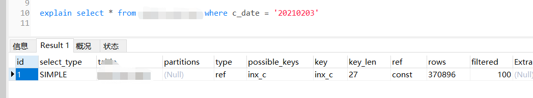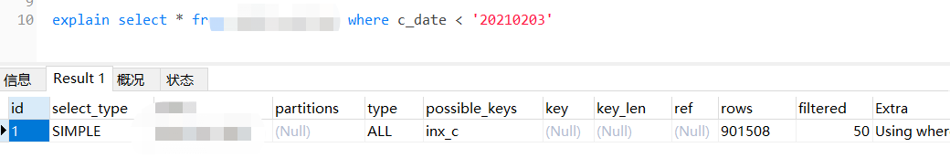 我们不难从图中看出,这个查询语句直接走了全表扫描。这个时候,我们不难猜想到一点点问题。