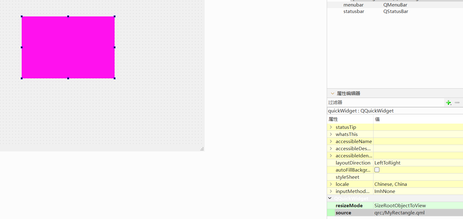 白色区域就是QQuickWidget 控件,之后设置路径 在source中填入我们需要写入的QML文件路径