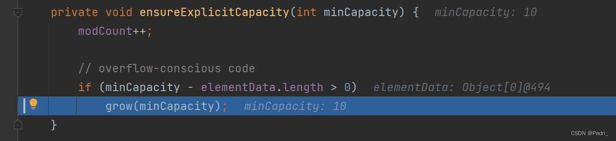ensureExplictitCapacity()方法为确定要扩容的方法,modCount是记录集合被修改的次数。if语句的含义是如果数组长度不够最小需要的长度,就执行扩容。grow为真正扩容的方法。