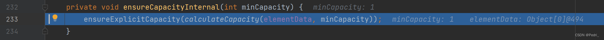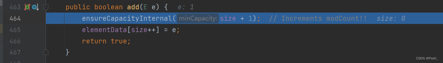 可以看到,在add方法的第一行,有一个ensureCapacityInternal()的方法,每次执行add()方法总是会执行 ensureCapacityInternal()方法,其含义是是否执行扩容。