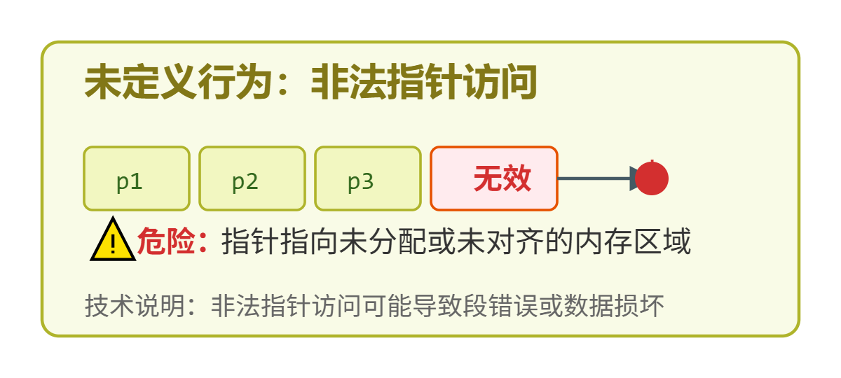 char *s = "hello"; s[0] = 'H'; // UB:字符串常量不可修改 - 指针非法转换和不对齐访问