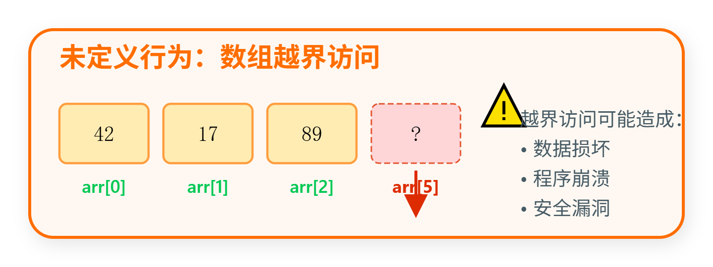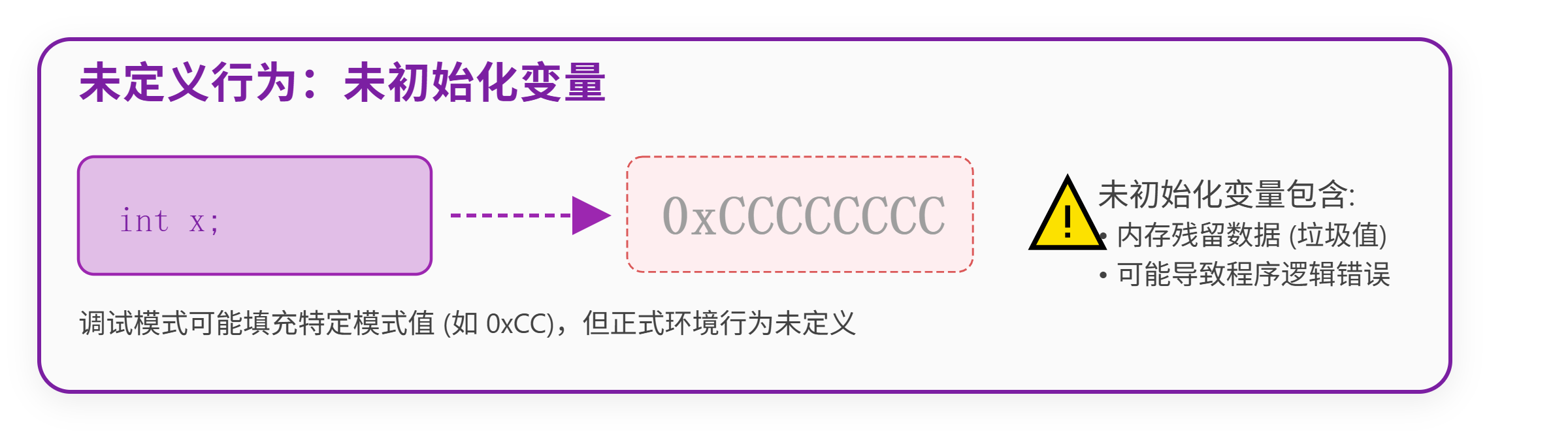 int arr[3] = {1,2,3}; int x = arr[5]; // UB:越界读 - 使用未初始化的变量