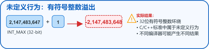 int x; printf("%d\n", x); // UB:x的值未定义 - 整数溢出(有符号)