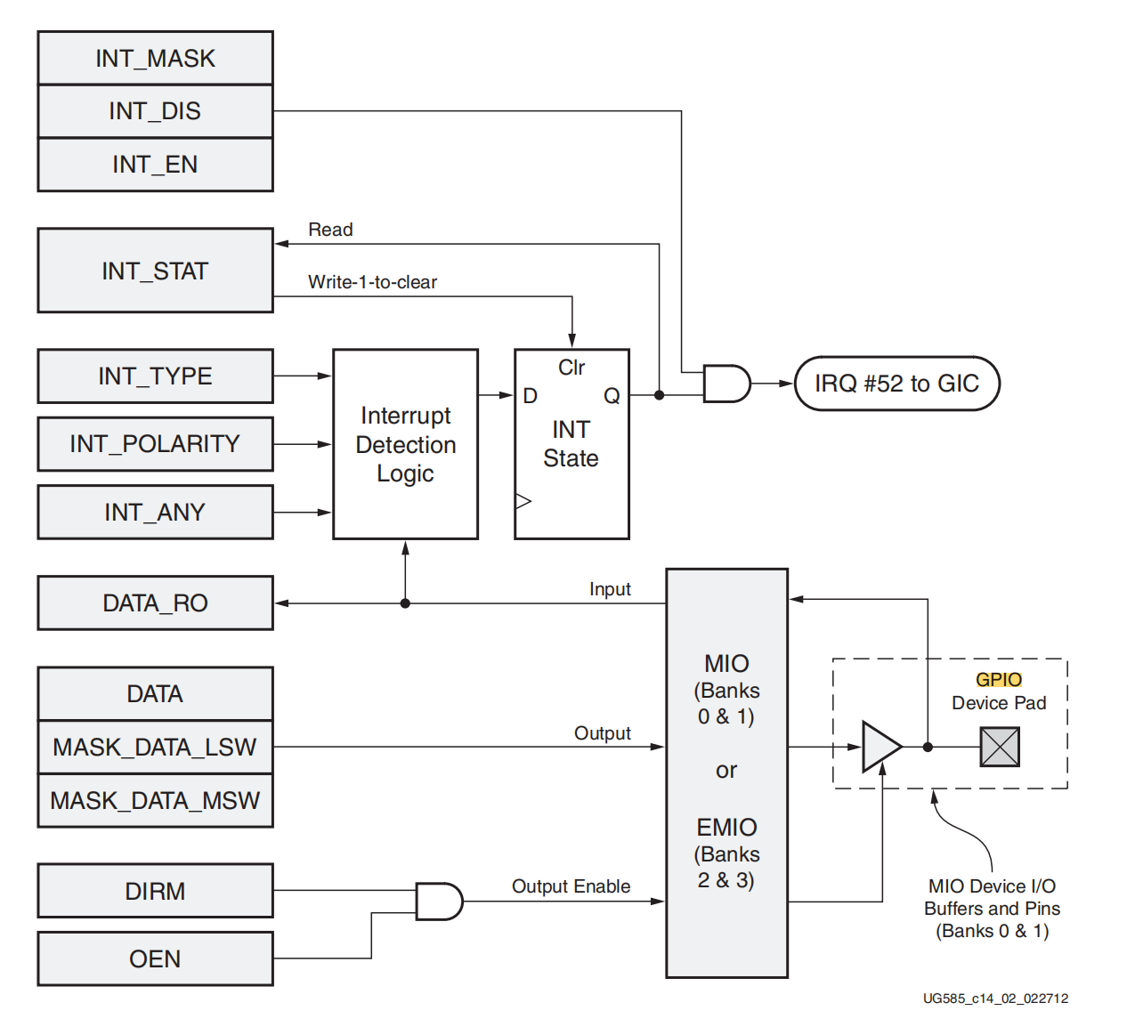 左边就是与GPIO有关的各个寄存器,INT开头的和中断相关,下面的就是读写寄存器、读写方向控制寄存器、输出使能寄存器,MIO Banks被复用到GPIO,GPIO输出三态门(我的理解这个三态门和STM32里面GPIO外设应该是一样道理)