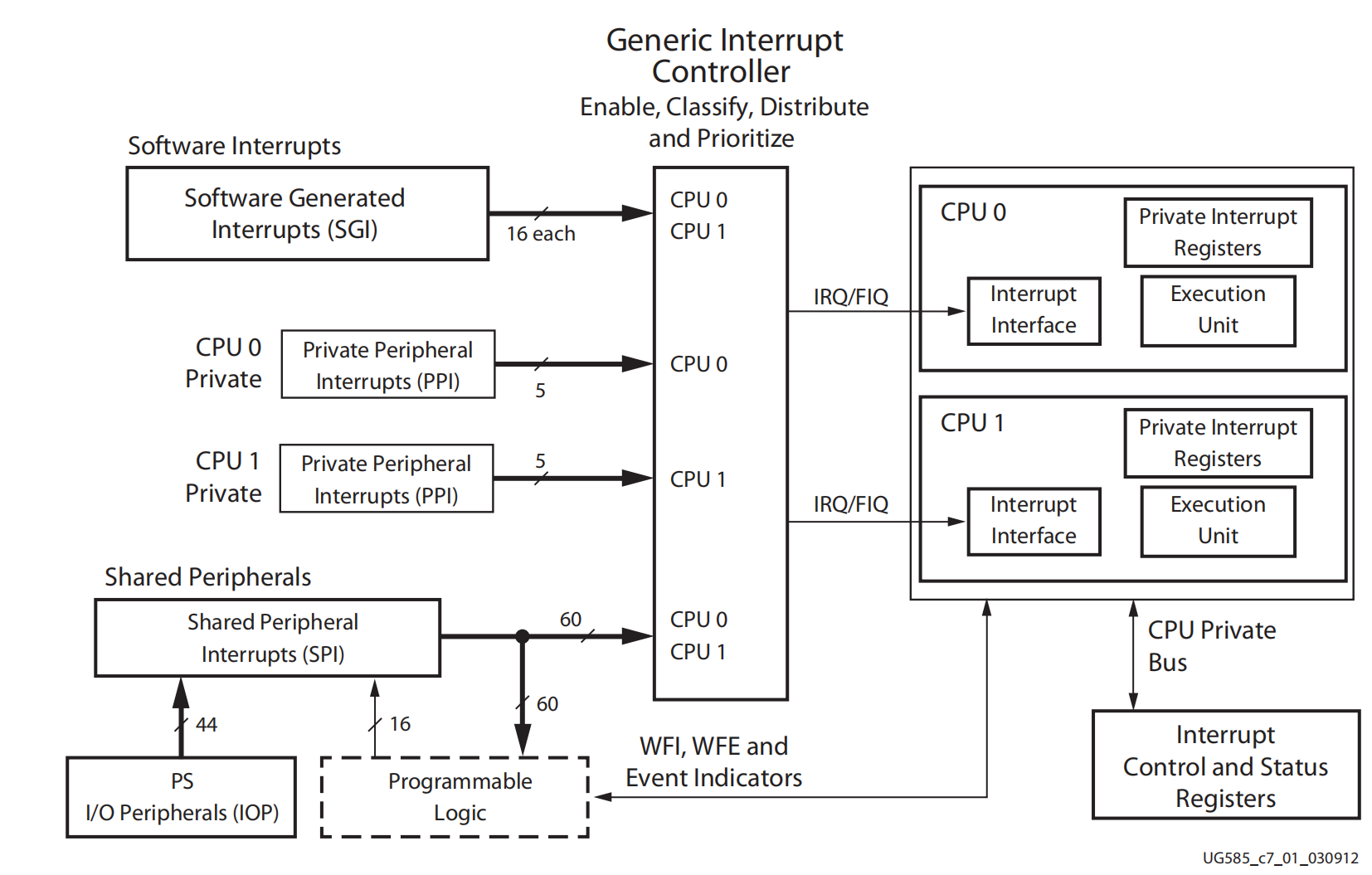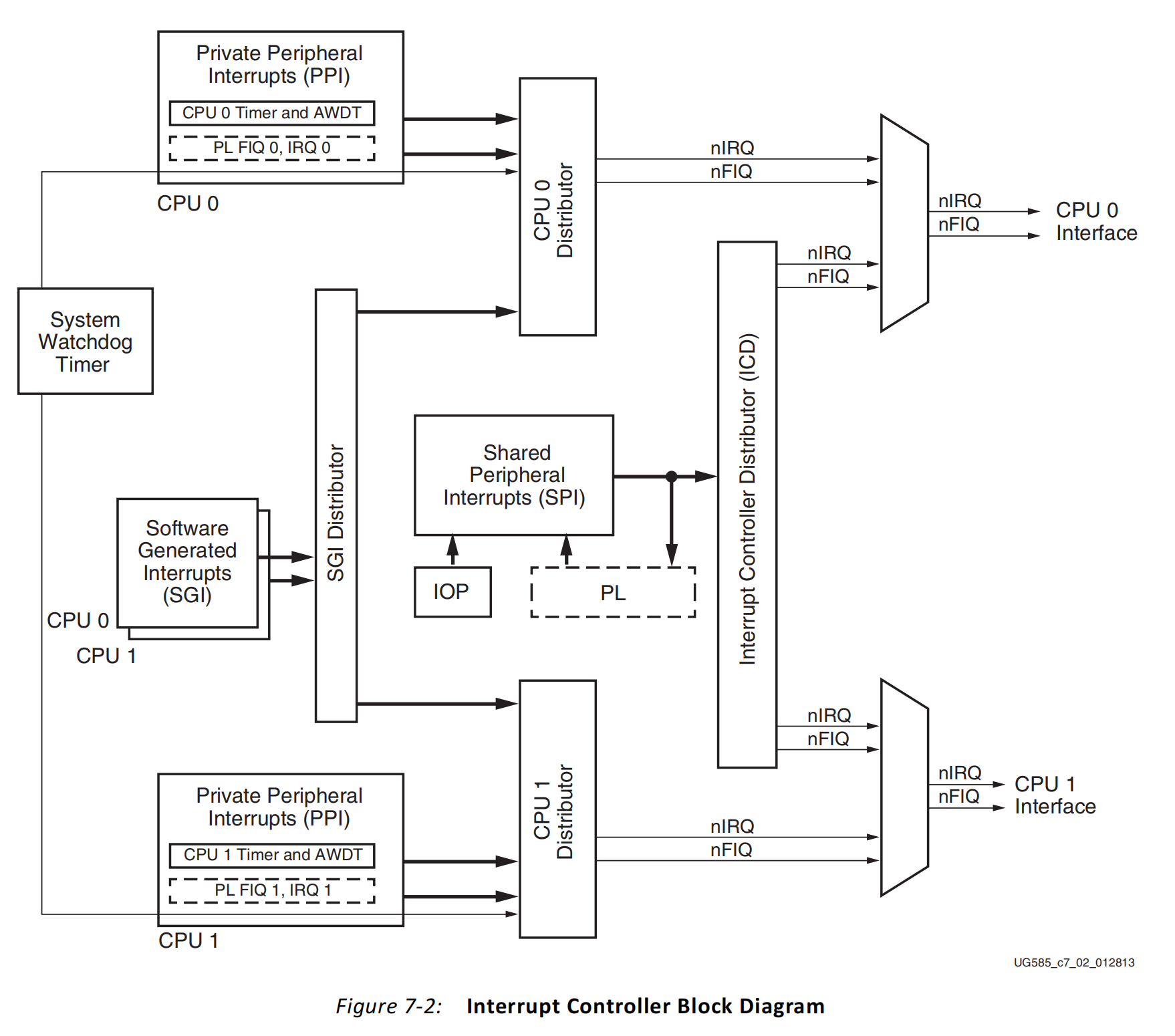 中断分为SPI、SGI、PPI,对应共享外设中断、软件生成中断和私有外设中断,PPI对应定时器、看门狗等,GPIO产生中断对应SPI。