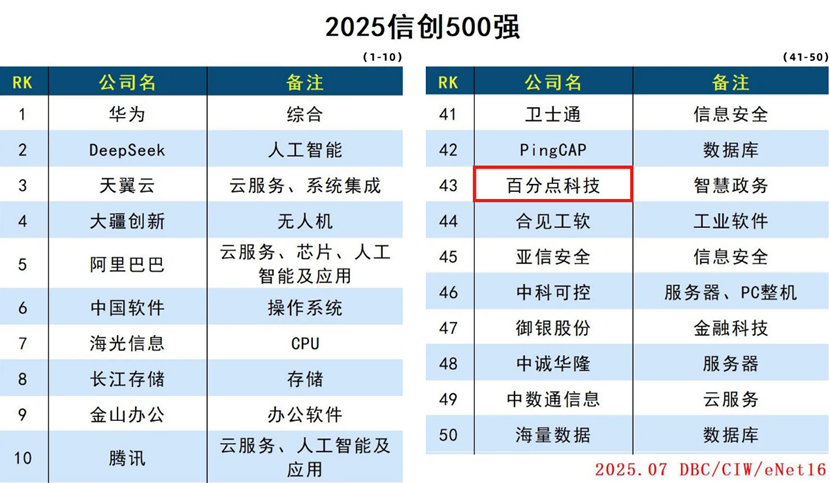 “2025信创产业500强”榜单于近日正式发布,该榜单由德本咨询联合互联网周刊、eNet研究院共同发布,百分点科技凭借在智慧政务等领域创新的信息技术应用再次荣登榜单,位列第43名,连续五年入选“信创500强”。