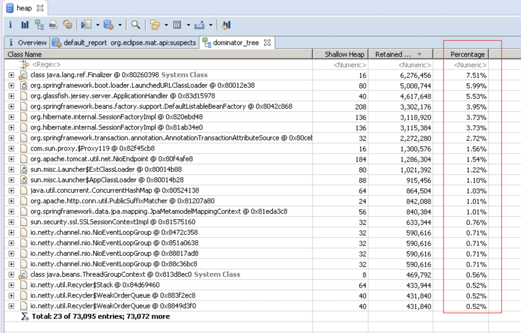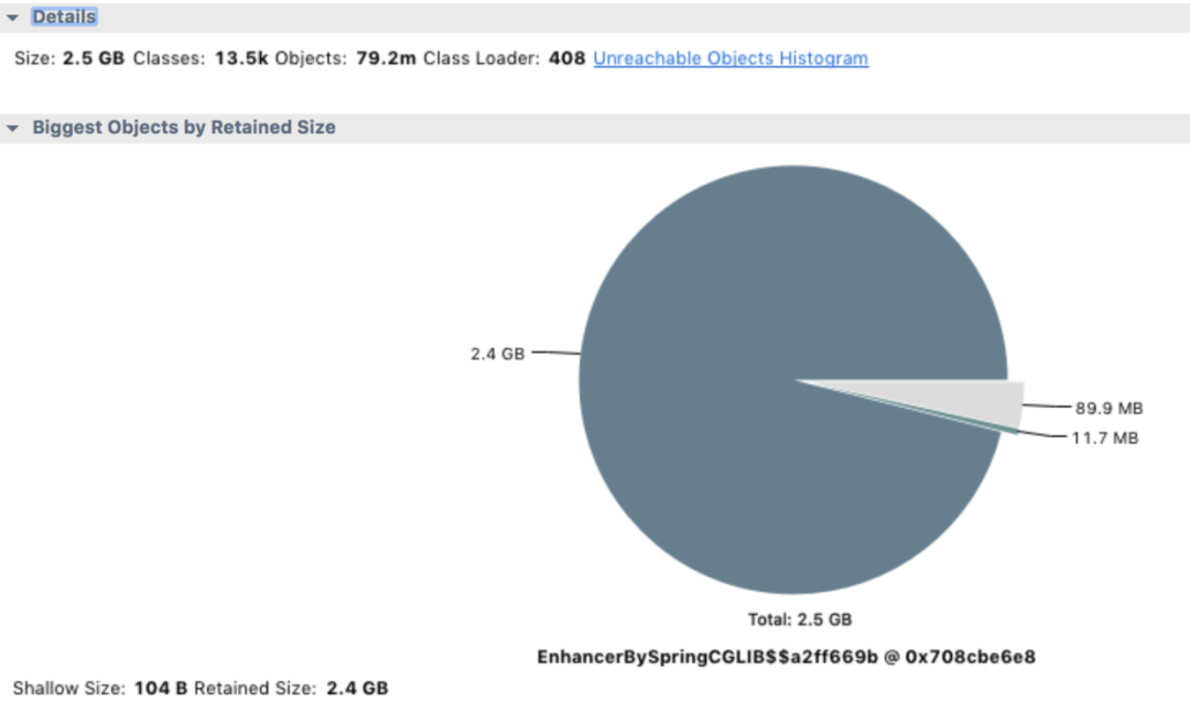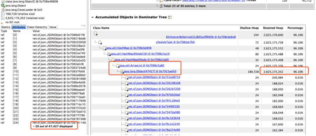 使用MAT工具分析jvm Heap,从上面的饼图中可以看出,绝大多数堆内存都被同一个内存占用了,再查看堆内存详情,向上层追溯,很快就发现了罪魁祸首。
