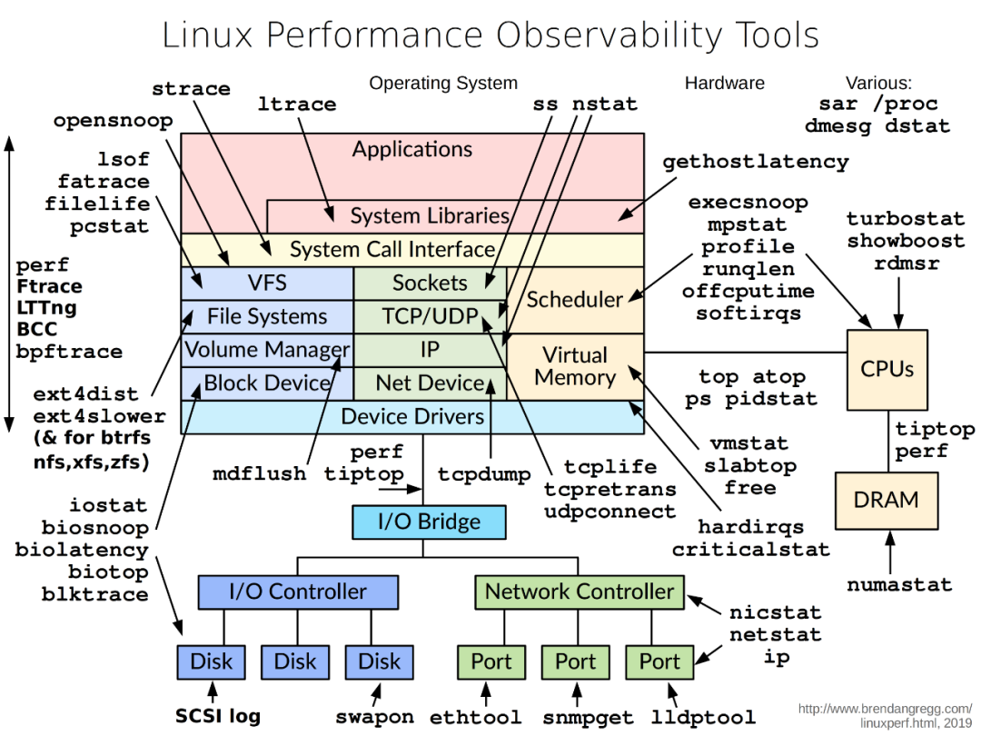 除了常用的 top、 ps、vmstat、iostat 等命令,还有其他 Linux 工具可以诊断系统问题,如 mpstat、tcpdump、netstat、pidstat、sar 等。此处总结列出了 Linux 不同设备类型的性能诊断工具,如下图所示,可供参考。