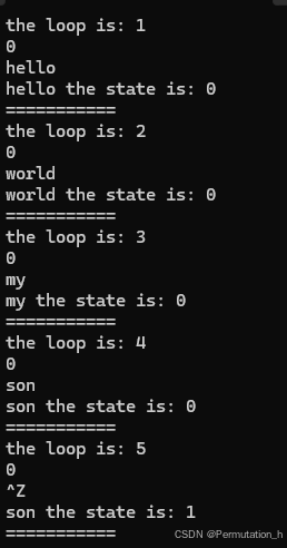 eof标志位的修改是在循环体内部输入ctrl z的时候,此时cin并没有覆盖s1保存的上次输入的值,即“son”,因此会多出来一个。 crtl z将eofbit和failbit置1,随后while检查eof并退出循环 |