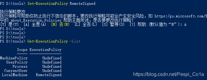 默认powershell执行策略为:Restricted ,需要改为RemoteSigned
