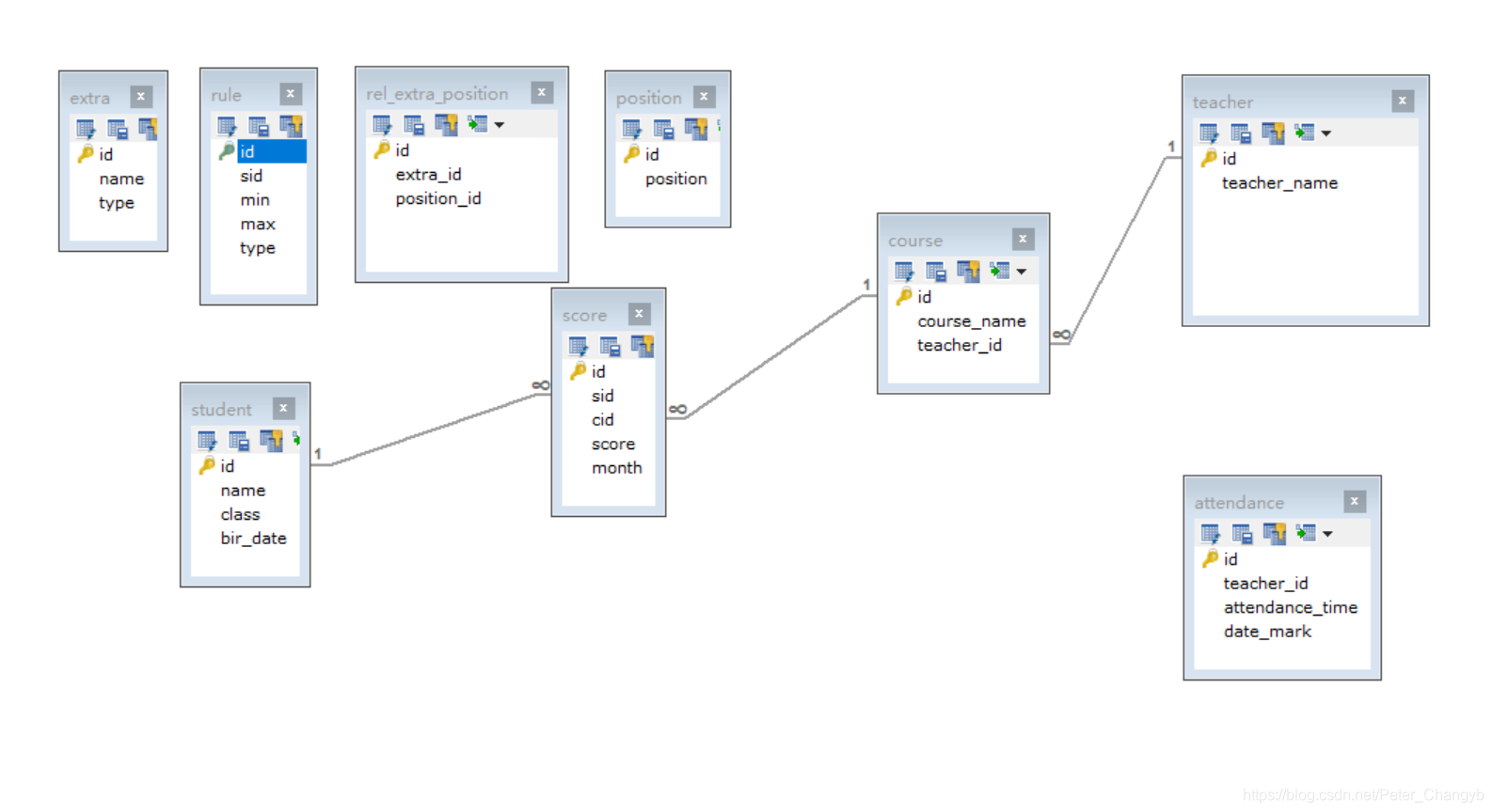 7、学生可以报名参加课外活动(extra),课外活动和地点(position)是多对多的关系(rel_extra_position),课外活动分为两类(extra.type),学生允许参加课外活动数量有最大和最小限制(rule),要求同一学生的所有课外活动在同一地点,查询每个学生课外活动可能的地点