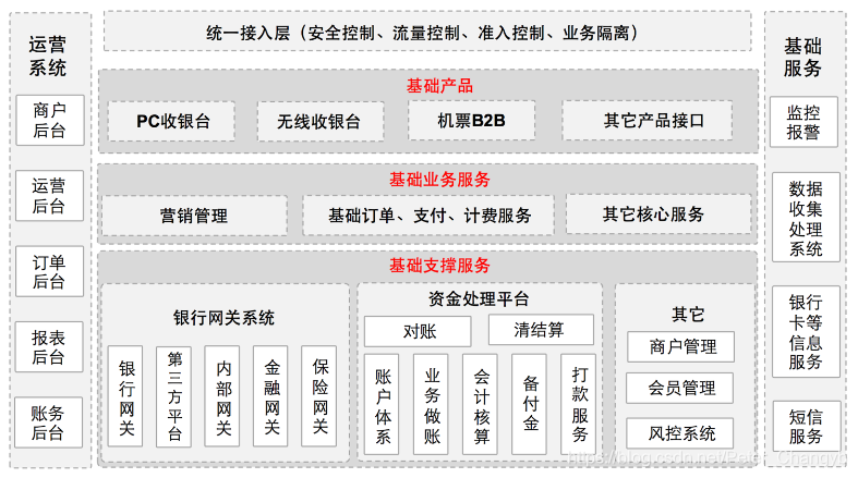 支持支付核心系统所提供的功能。服务系统又分为基础服务系统、资金系统、风控和信用系统。
