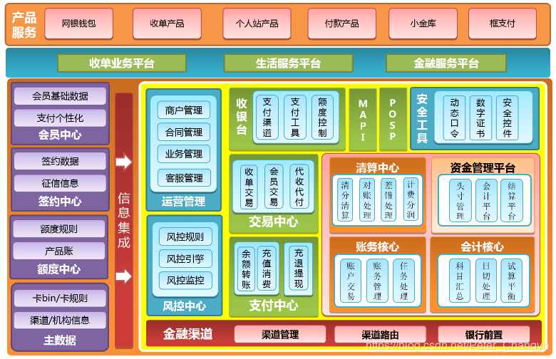 产品层: 通过核心层提供的服务组合起来,对最终用户、商户、运营管理人员提供的系统。