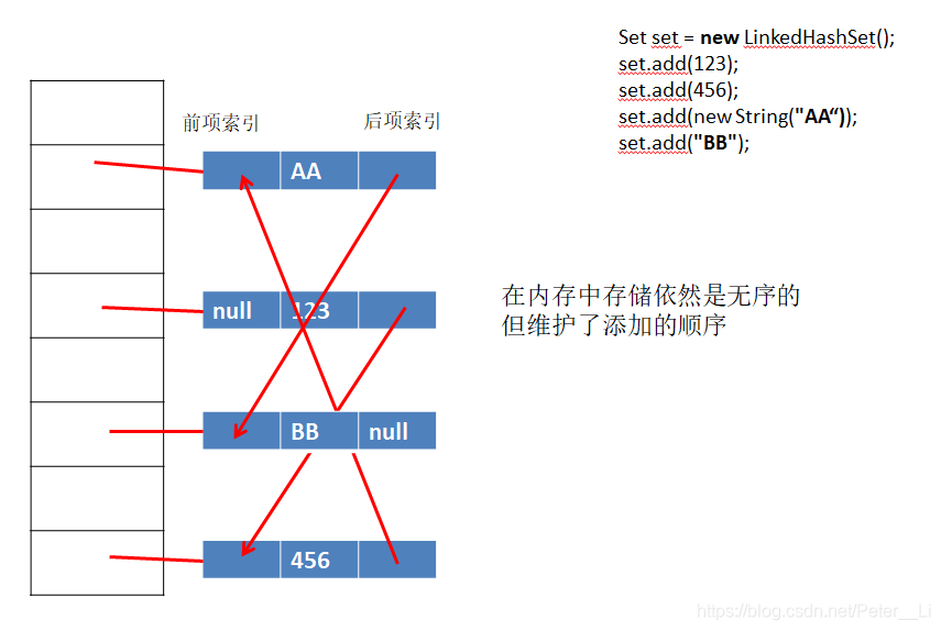 /** * Collection接口 * |-------List接口 * |--------ArrayList(主要的实现类) * |--------LinkedList(对于频繁的插入、删除操作) * |--------Vector(古老的实现类、线程安全的,但效率低于ArrayList) * |-------Set接口:存储无序、不可重复的元素.Set中常用的方法都是Collection下定义的。 * |--------HashSet(主要的实现类) * |--------LinkedHashSet * |--------TreeSet * * Set:存储的元素是无序的,不可重复的! * 1.无序性:无序性 != 随机性。真正的无序性,指的是元素在底层存储的位置是无序的。 * 2.不可重复性:当向Set中添加进相同的元素的时候,后面的这个不能添加进去. * * 说明:要求添加进Set中的元素所在的类,一定要重写equals()和hashCode()方法。进而保证Set元素的不可重复性! * * Set中的元素是如何存储的呢?使用哈希算法。 * 当向Set中添加对象时,首先调用此对象所在类的hashCode()方法,计算此对象的哈希值,此哈希值 * 决定了此对象在Set中的存储位置。若此位置之前没有对象存储,则这个对象直接存储到此位置。若此位置 * 已经有对象存储,再通过equals()方法比较这两个对象是否相同。如果相同,后一个对象就不能再添加进来。 * 万一返回false呢,都存储。(不建议如此) * > 要求:hashCode()方法要与equals()方法一致。 * * */ public class TestSet { /** * LinkedHashSet:使用链表维护了一个添加进集合中的顺序,导致当我们遍 * 历LinkedHashSet集合元素时,是按照添加进去的顺序遍历的! * * LinkedHashSet插入性能略低于HashSet,但在迭代访问Set里的全部元素时有很好的性能 * */ @Test public void test2(){ Set set = new LinkedHashSet(); set.add(123); set.add(456); set.add("AA"); set.add("AA"); set.add("BB"); set.add(null); Iterator iterator = set.iterator(); while (iterator.hasNext()){ System.out.println(iterator.next()); } } }结果: