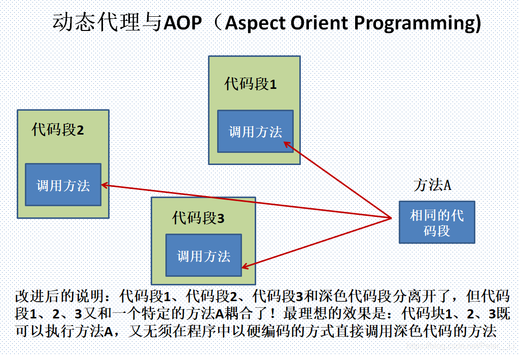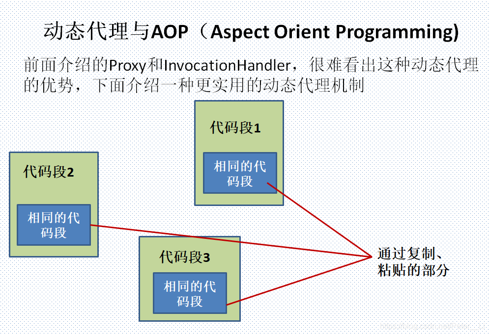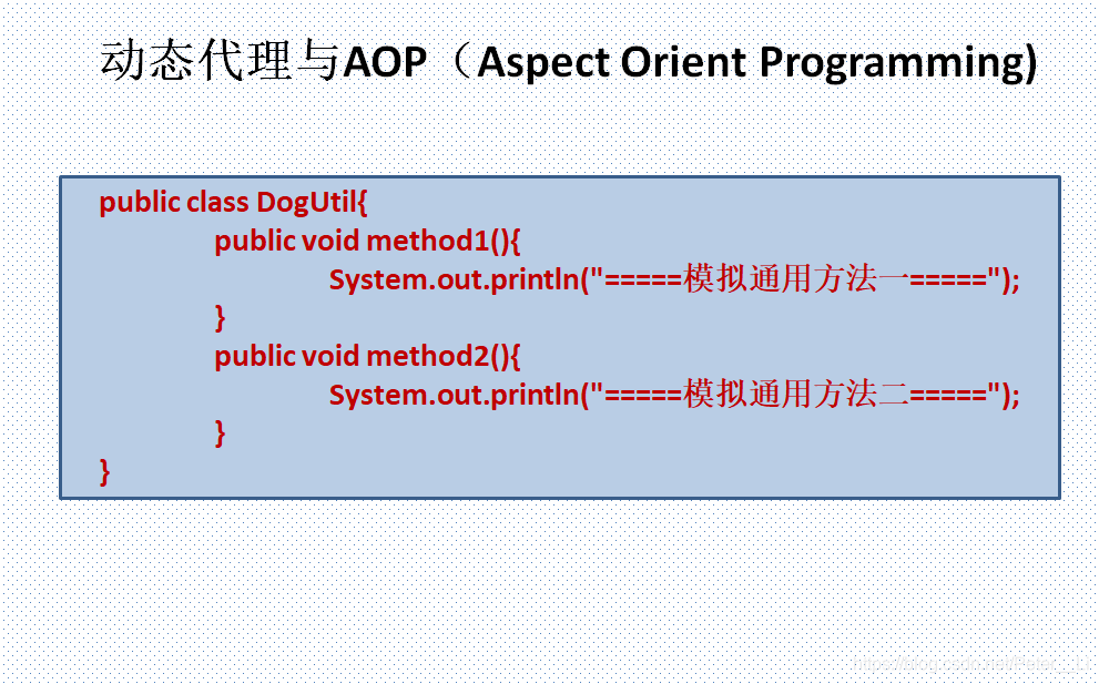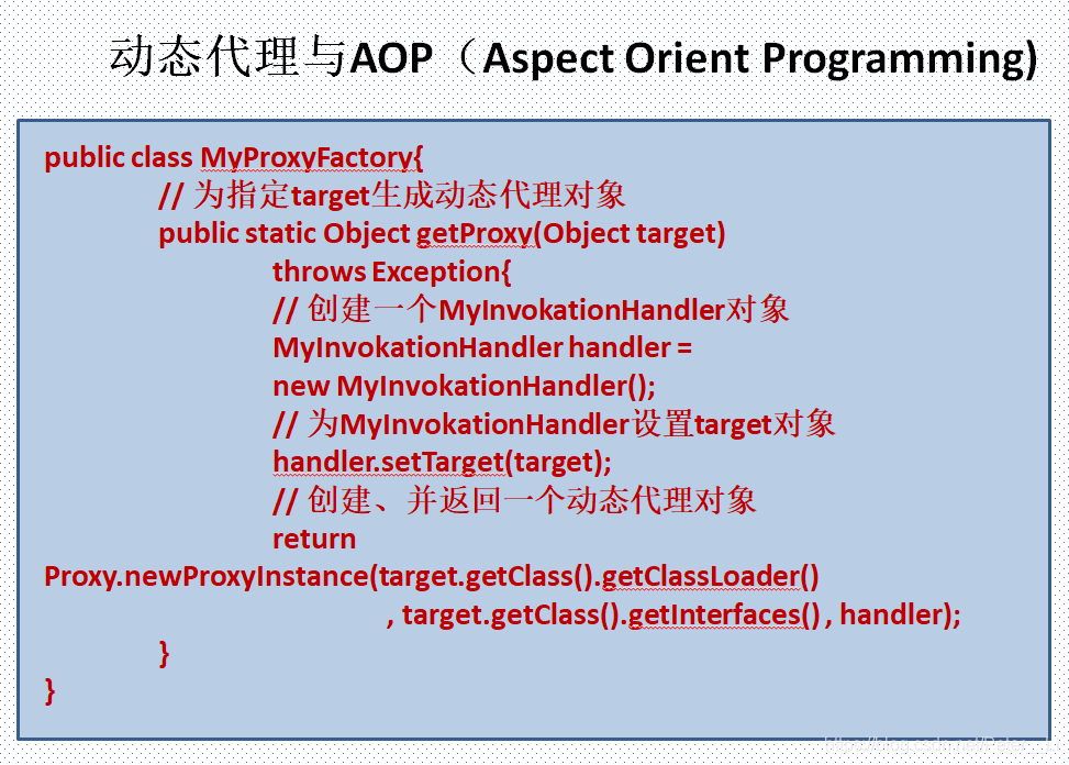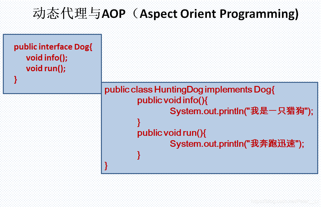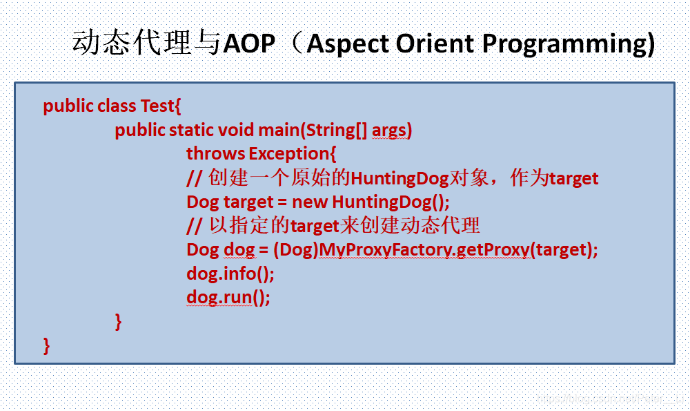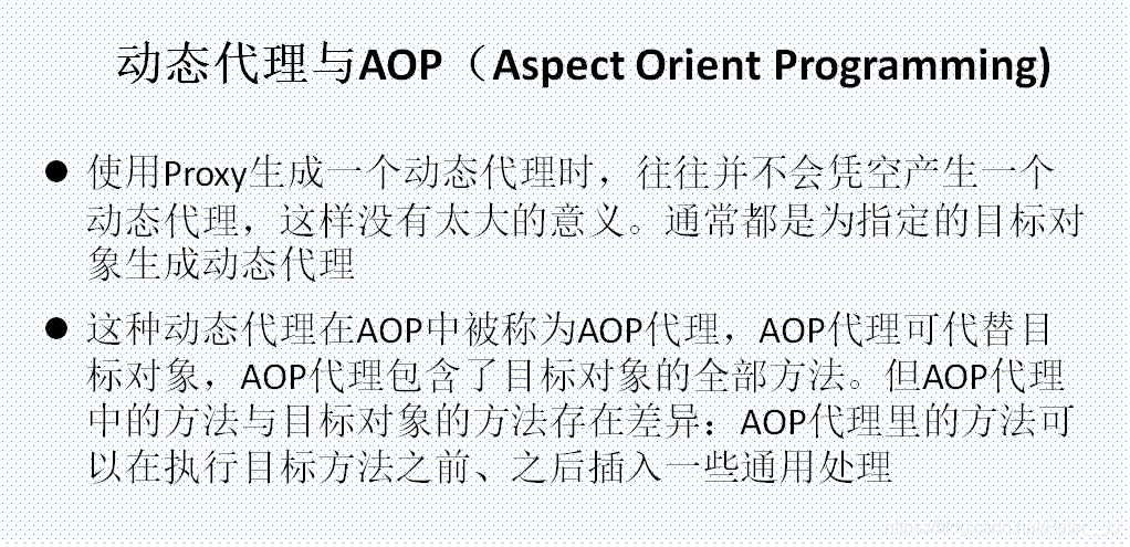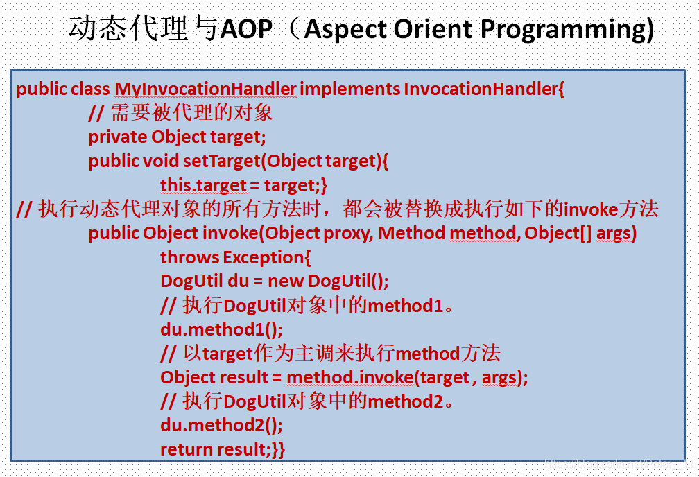 interface Human { void info(); void fly(); } //被代理类 class SuperMan implements Human { @Override public void info() { System.out.println("我是蜘蛛侠!"); } @Override public void fly() { System.out.println("I believe I can fly!"); } } class HumanUtil { public void method1() { System.out.println("=====方法二======"); } public void method2() { System.out.println("=====方法二======"); } } class MyInvocationHandler1 implements InvocationHandler { Object obj; //被代理类对象的声明 public void setObject(Object obj) { this.obj = obj; } @Override public Object invoke(Object proxy, Method method, Object[] args) throws Throwable { HumanUtil h = new HumanUtil(); h.method1(); Object returnVal = method.invoke(obj, args); h.method2(); return returnVal; } } class MyProxy { //动态的创建一个代理类的对象 public static Object getProxyInstance(Object obj) { MyInvocationHandler1 handler1 = new MyInvocationHandler1(); handler1.setObject(obj); return Proxy.newProxyInstance(obj.getClass().getClassLoader(), obj.getClass().getInterfaces(), handler1); } } public class TestAOP { public static void main(String[] args) { SuperMan man = new SuperMan(); //创建一个被代理类的对象 Object obj = MyProxy.getProxyInstance(man);//返回一个代理类的对象 Human human = (Human) obj; human.info(); //通过代理类的对象调用重写的重现方法 System.out.println(); human.fly(); System.out.println(); //**************** NikeClothFactory nike = new NikeClothFactory(); Object obj1 = MyProxy.getProxyInstance(nike); ClothFactory cloth = (ClothFactory) obj1; cloth.productCloth(); } }结果:
