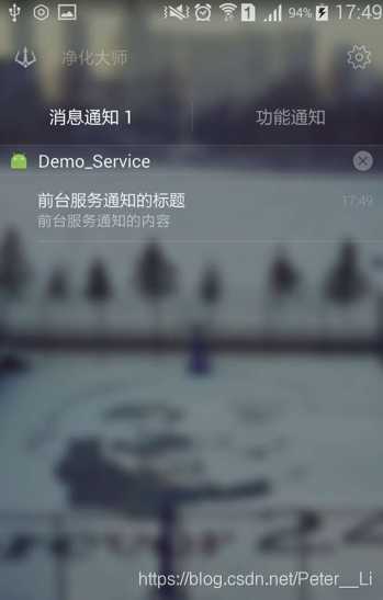 @Override public void onCreate() { super.onCreate(); Log.d(TAG, "onCreate: "); NotificationManager notificationManager = (NotificationManager) getSystemService(Context.NOTIFICATION_SERVICE); String channelId = getString(R.string.app_name); NotificationChannel notificationChannel = new NotificationChannel(channelId, channelId, NotificationManager.IMPORTANCE_DEFAULT); notificationChannel.setDescription(channelId); notificationChannel.setSound(null, null); notificationManager.createNotificationChannel(notificationChannel); Intent intent = new Intent(getApplicationContext(), MainActivity.class); PendingIntent pendingIntent = PendingIntent.getActivity(this, 0, intent, 0); Notification.Builder builder = new Notification.Builder(this, channelId); builder.setContentTitle("这是一个标题"); builder.setContentText("这是一个内容"); builder.setSmallIcon(R.mipmap.ic_launcher); builder.setLargeIcon(BitmapFactory.decodeResource(getResources(), R.mipmap.ic_launcher)); builder.setContentIntent(pendingIntent); Notification notification = builder.build(); startForeground(1, notification); }3. 测试结果(本人还是懒得截图,贴上原网站的图片)