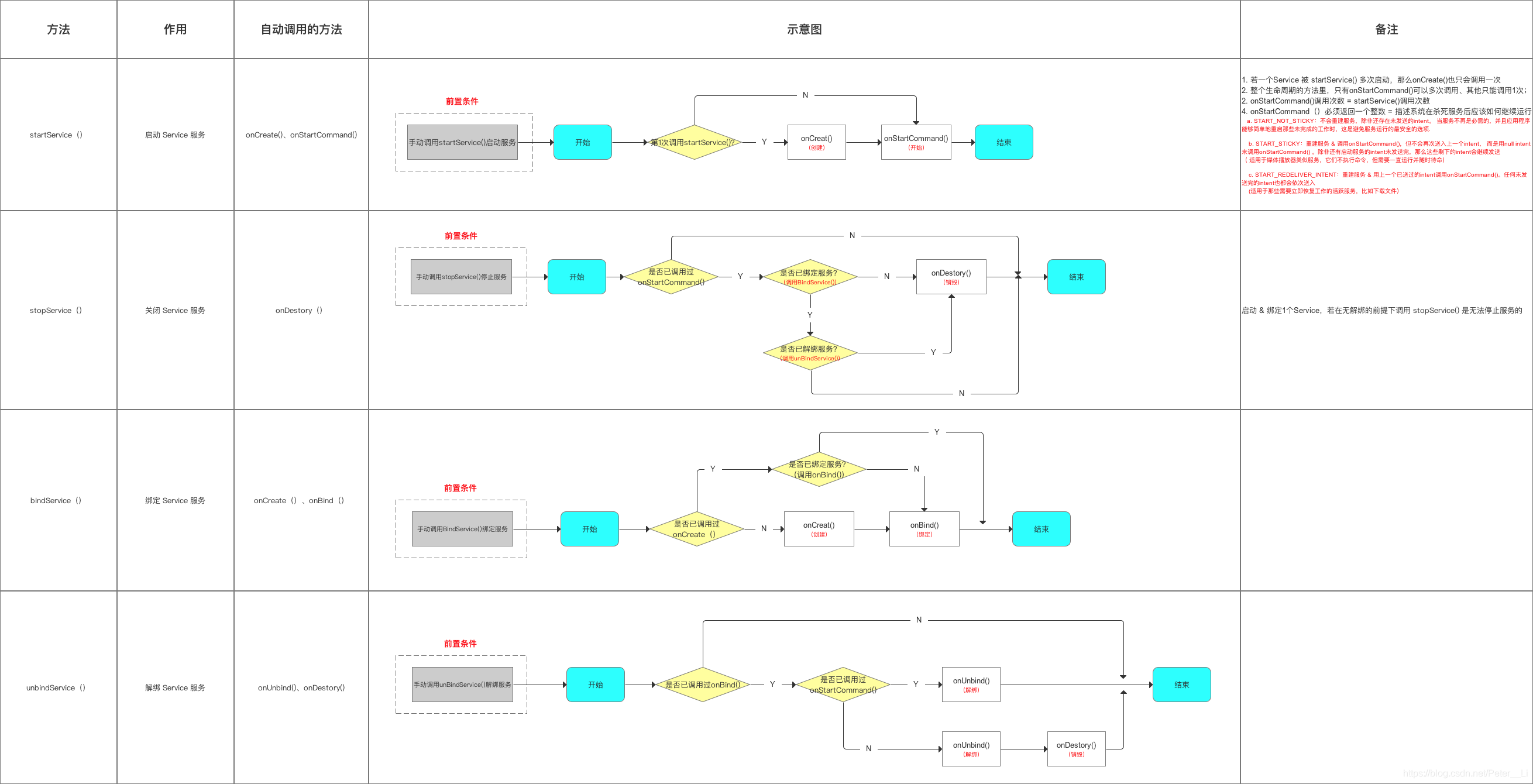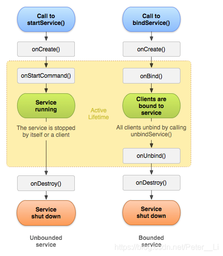 手动调用方法 作用 startService() 启动服务 stopService() 关闭服务 bindService() 绑定服务 unbindService() 解绑服务