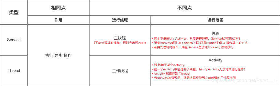 注:Service是在主线程里执行操作的,可能会因为执行耗时操作而导致ANR(Application Not Responding),即无响应。