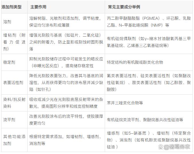除了树脂和光敏剂,光刻胶中还包含多种添加剂,用以优化其涂布性能、稳定性、图形化质量等。