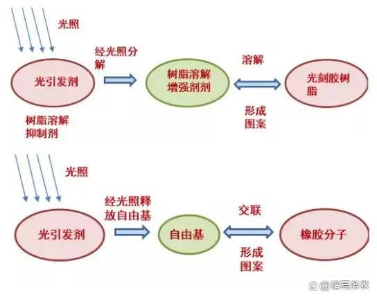 作用机理:吸收光能后产生自由基,引发树脂(如丙烯酸树脂、肉桂酸酯类树脂)的交联聚合反应,使曝光区域变成不溶物(负性光刻)4。