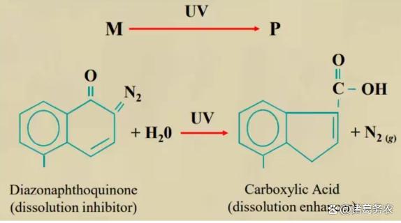 作用机理:常用于正性光刻胶。未曝光时,DNQ作为溶解抑制剂,降低树脂在碱性显影液中的溶解度;曝光后,DNQ发生Wolff重排反应,生成烯酮并进一步水解为羧酸,从而使曝光区域变得可溶于碱性显影液 。