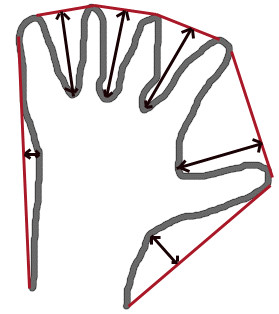 如上图所示,一只手有很多凸缺陷,需要一定的策略判断哪些是手指缝那些是干扰,可利用