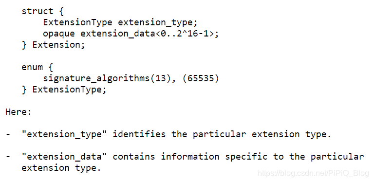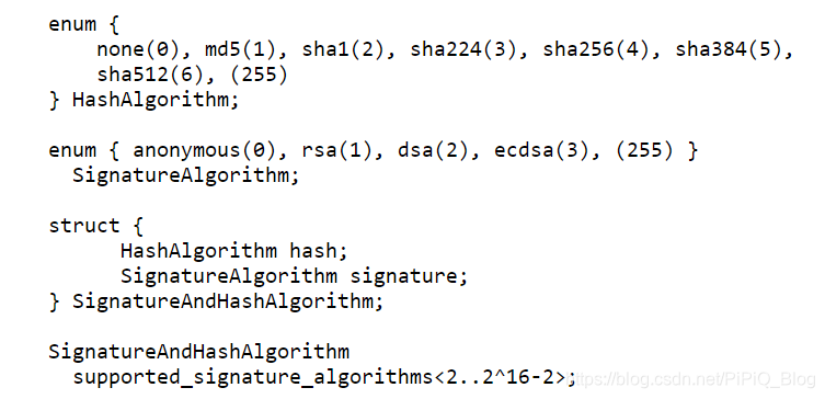 - TLS 扩展类型注册表:未来值通过 IETF 共识 [RFC2434] 分配。 IANA 已更新此注册表以包含 signature_algorithms 扩展及其相应值(请参阅第 7.4.1.4 节)。