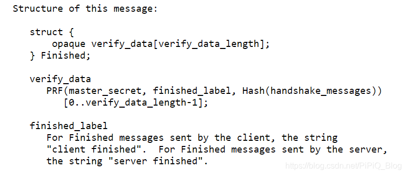 哈希表示握手消息的哈希。对于第 5 节中定义的 PRF,散列必须是用作 PRF 基础的散列。任何定义不同 PRF 的密码套件还必须定义用于完成计算的哈希。