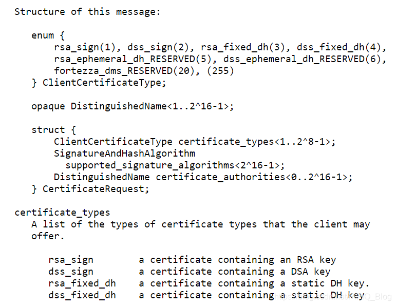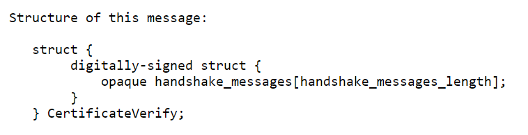 此消息用于提供对客户端证书的显式验证。此消息仅在具有签名功能的客户端证书之后发送(即,除包含固定 Diffie-Hellman 参数的证书之外的所有证书)。发送时,它必须立即遵循客户端密钥交换消息。