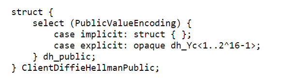 如果客户端的证书中尚未包含客户端的 Diffie-Hellman 公共值 (Yc),则该结构会传达客户端的 Diffie-Hellman 公共值 (Yc)。用于 Yc 的编码由枚举的 PublicValueEncoding 确定。此结构是客户端密钥交换消息的变体,而不是消息本身。