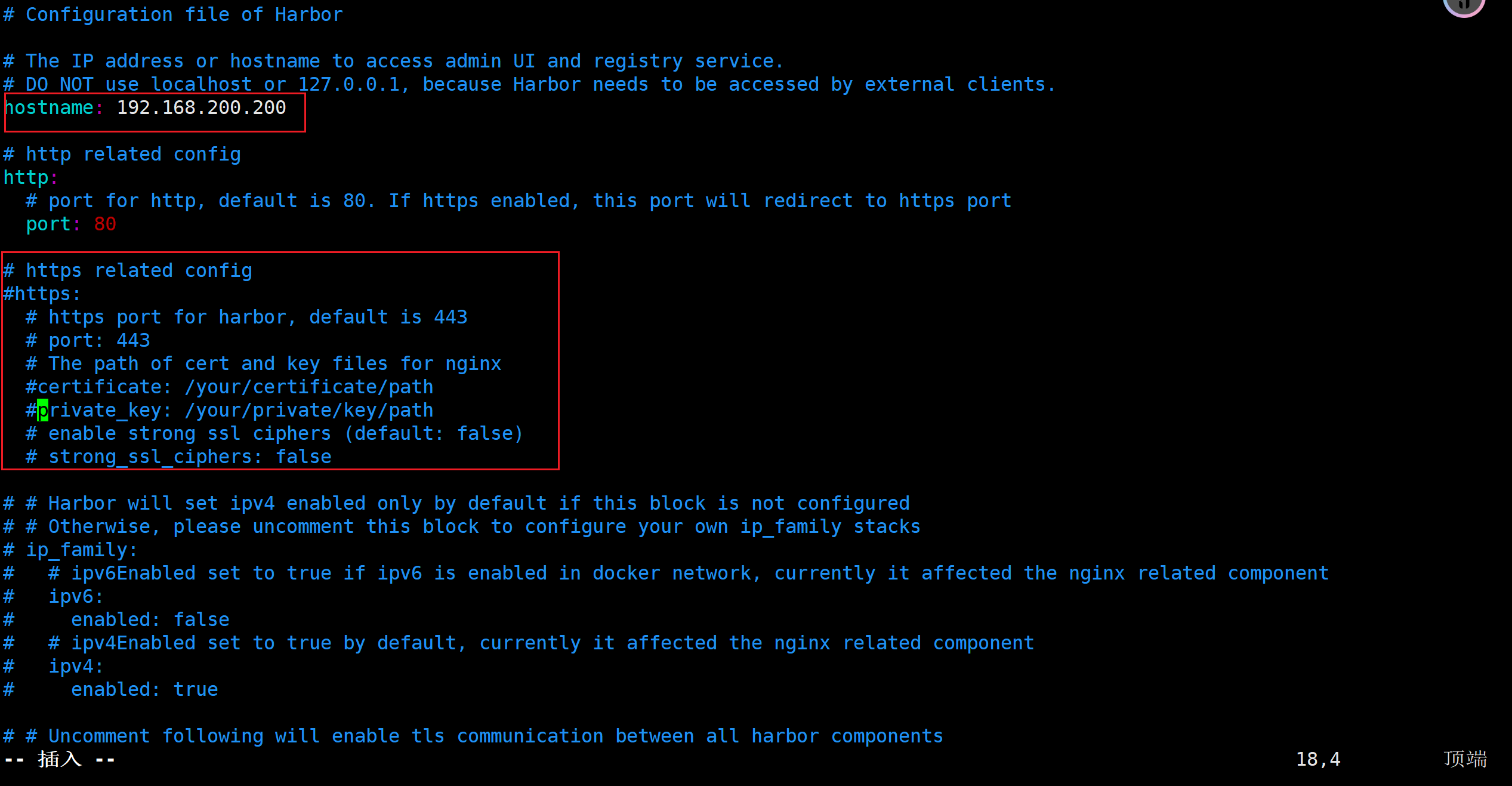 进入配置文件,将hostname改为本机IP,并将https部分注释掉