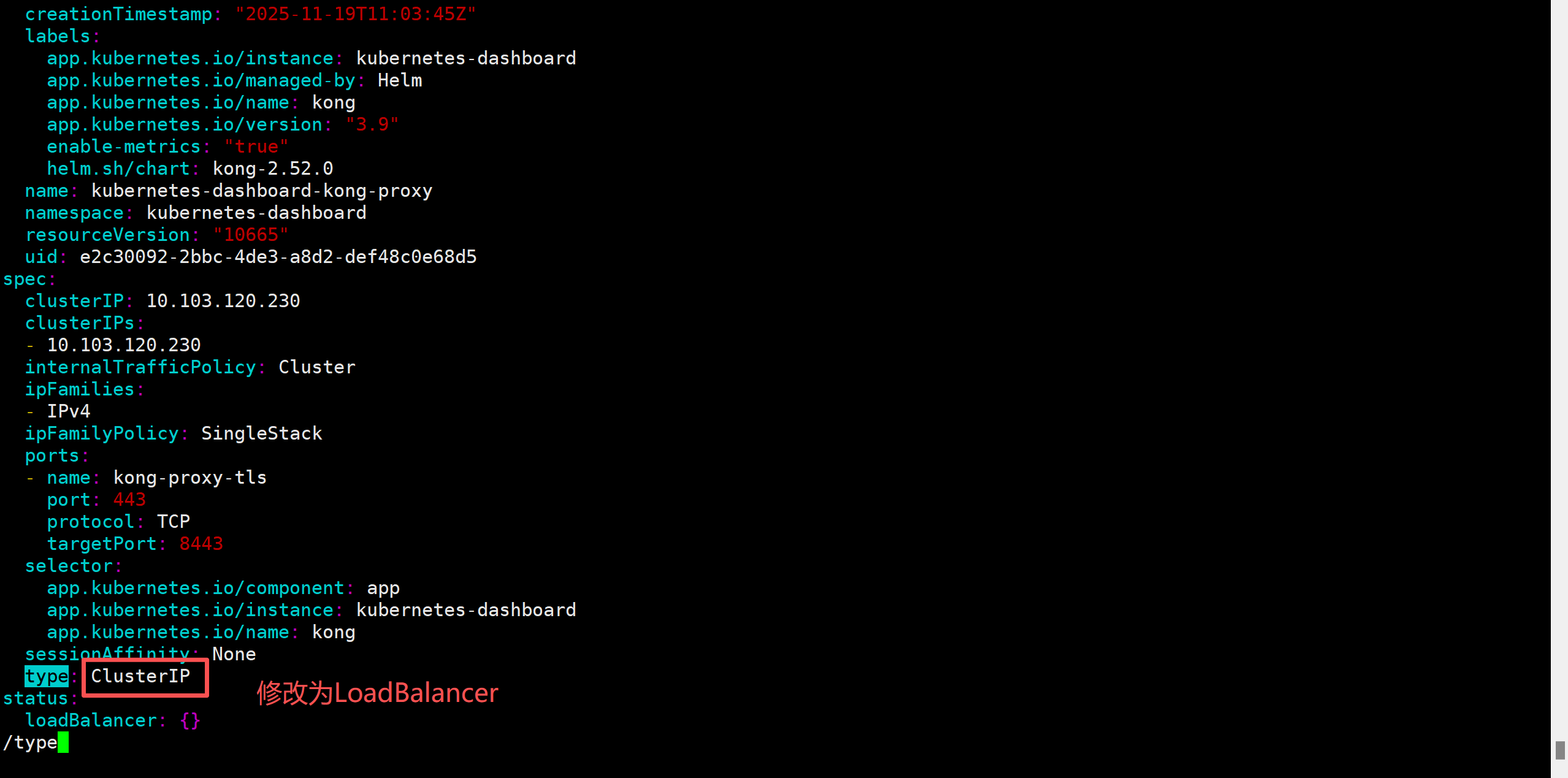 kubectl edit svc kubernetes-dashboard-kong-proxy -n kubernetes-dashboard