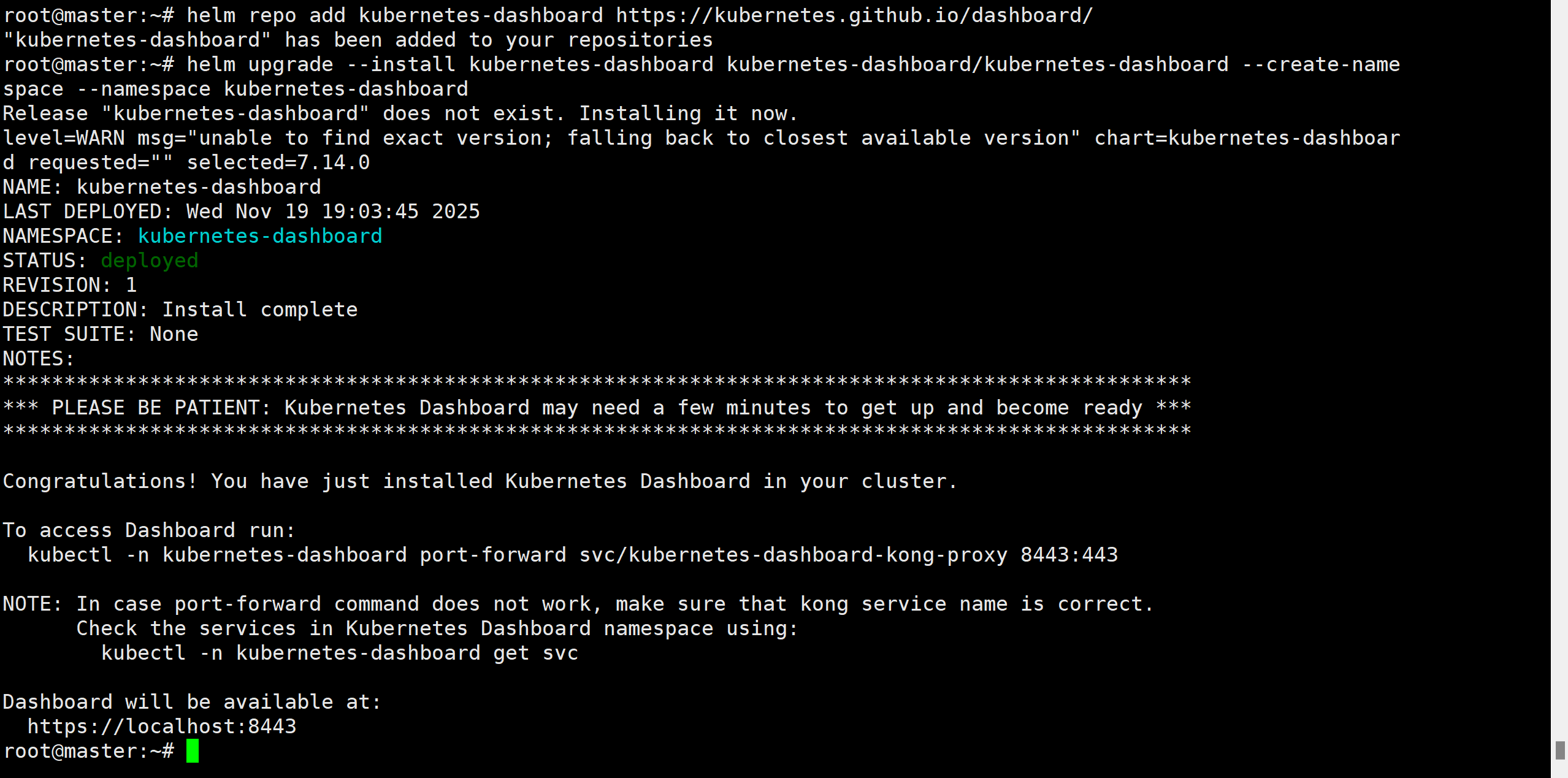 helm upgrade --install kubernetes-dashboard kubernetes-dashboard/kubernetes-dashboard --create-namespace --namespace kubernetes-dashboard