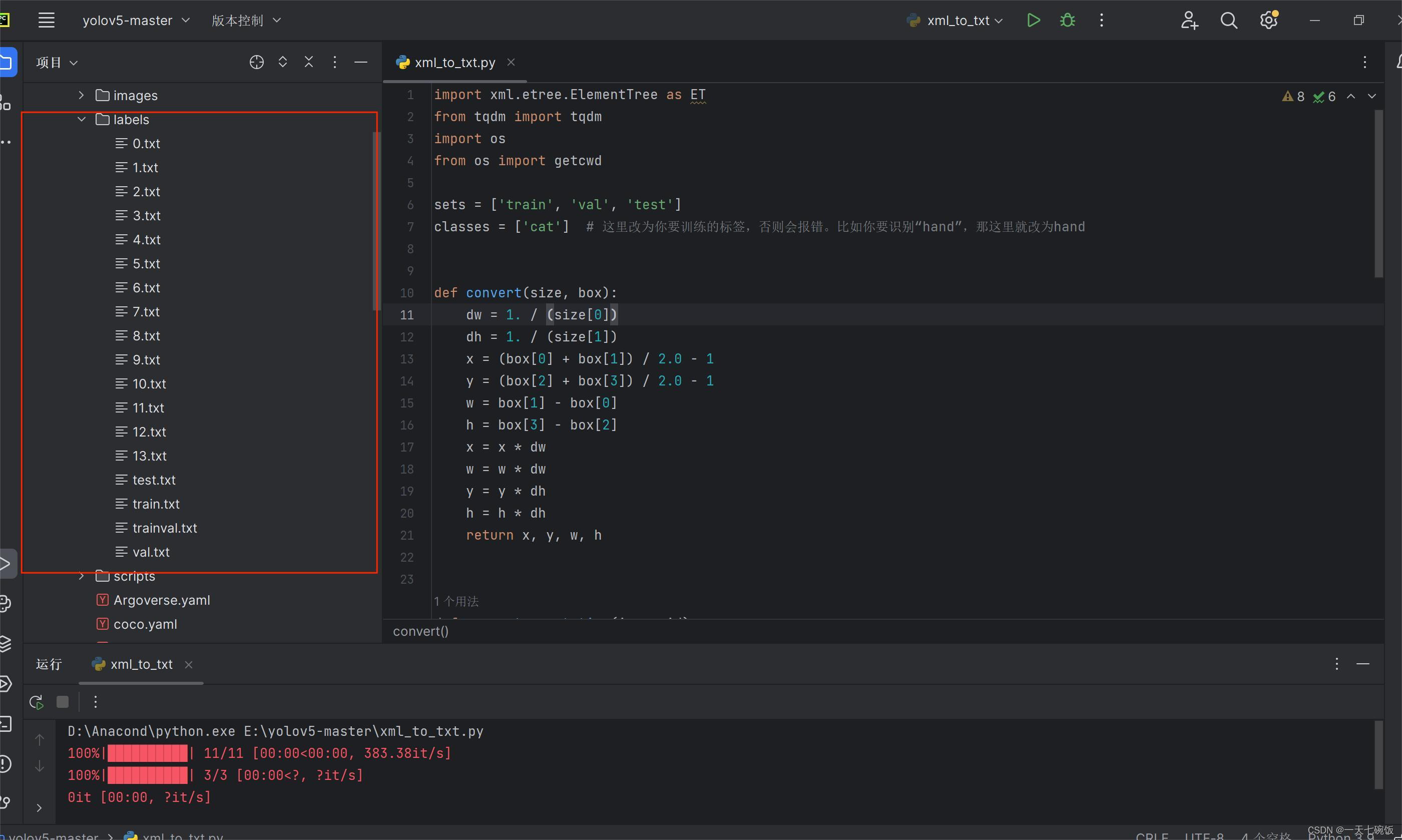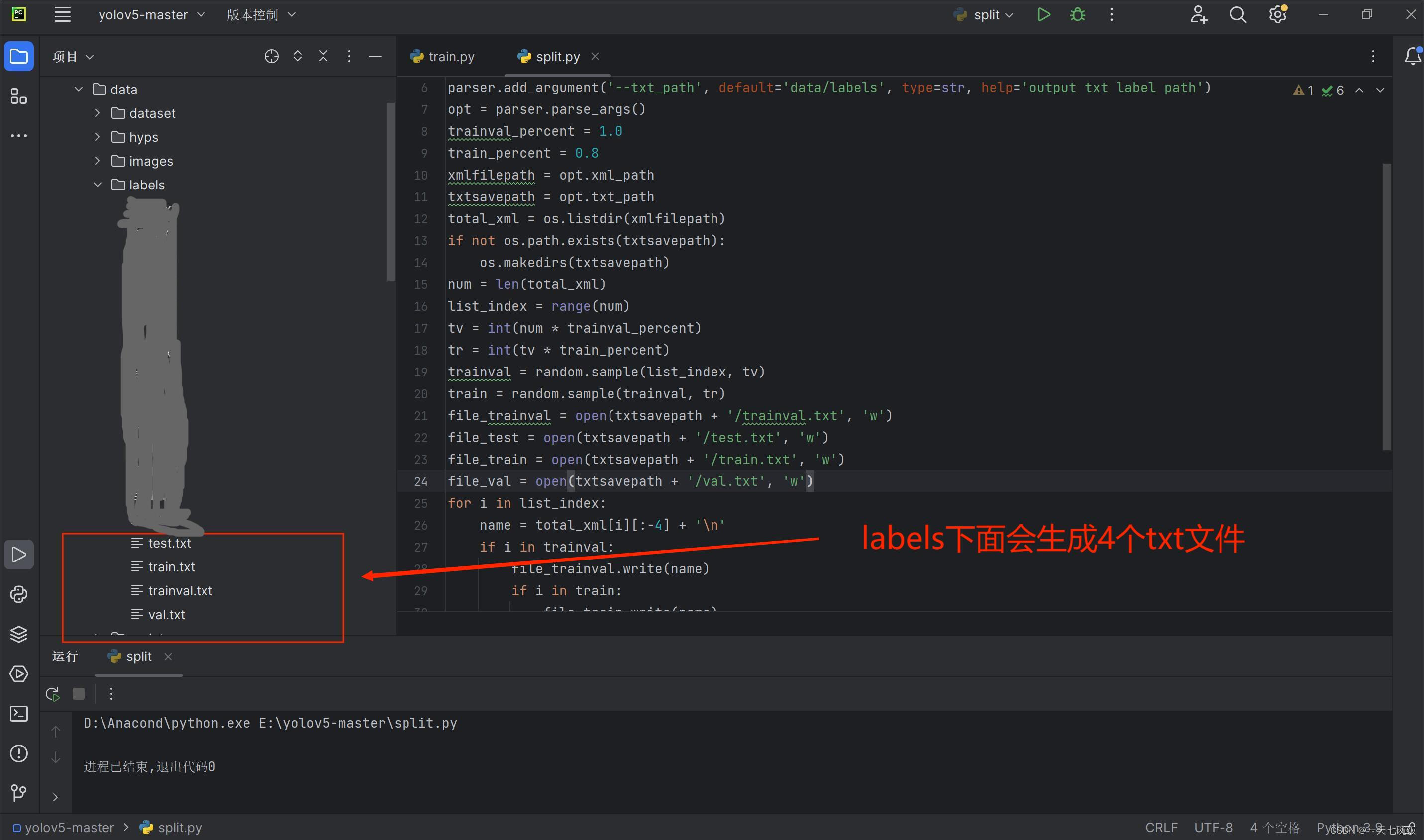 代码写好后运行。如果运行后没看到txt文件,去自己data下的labels文件夹里看,会有。在软件里显示会比较慢。