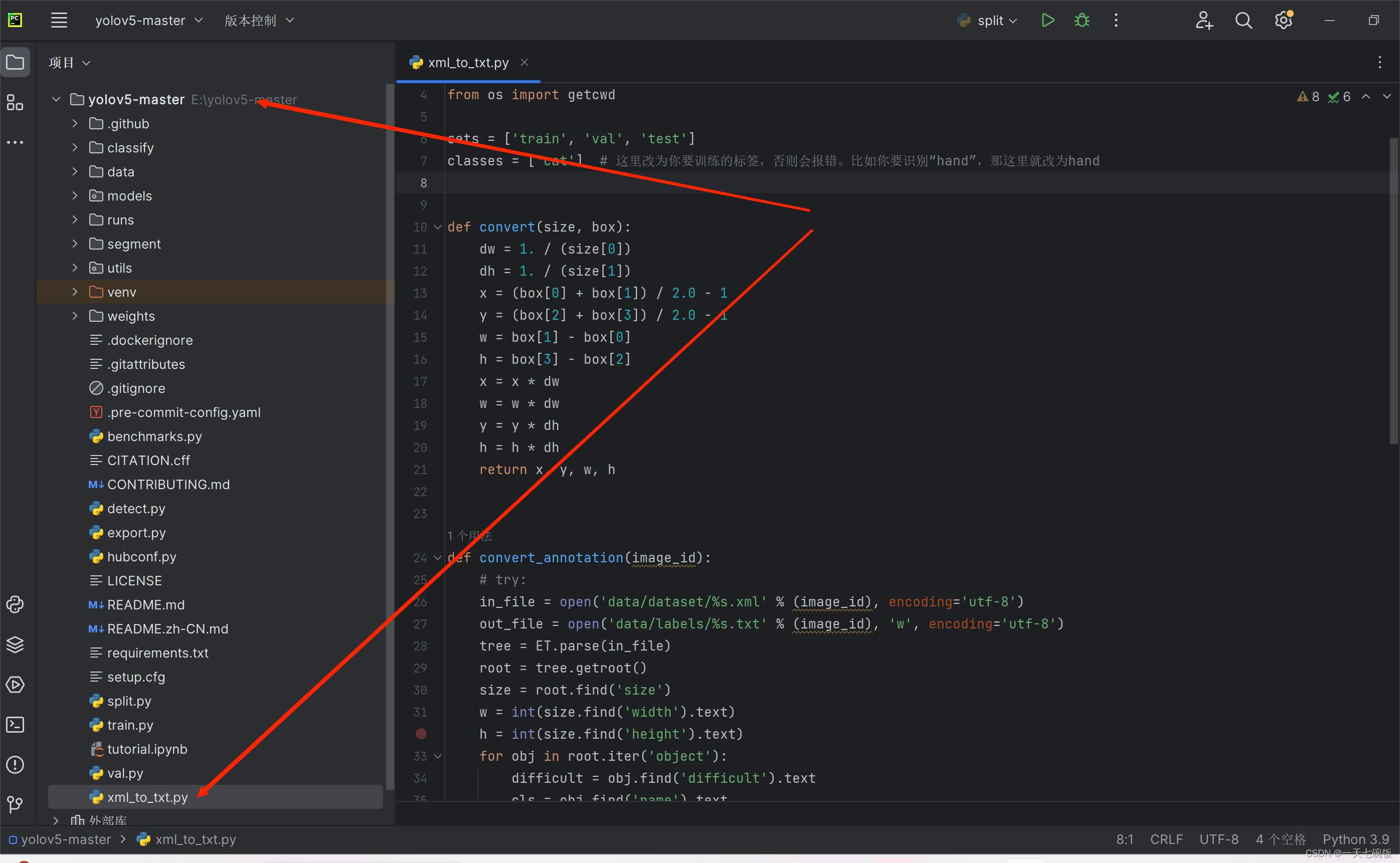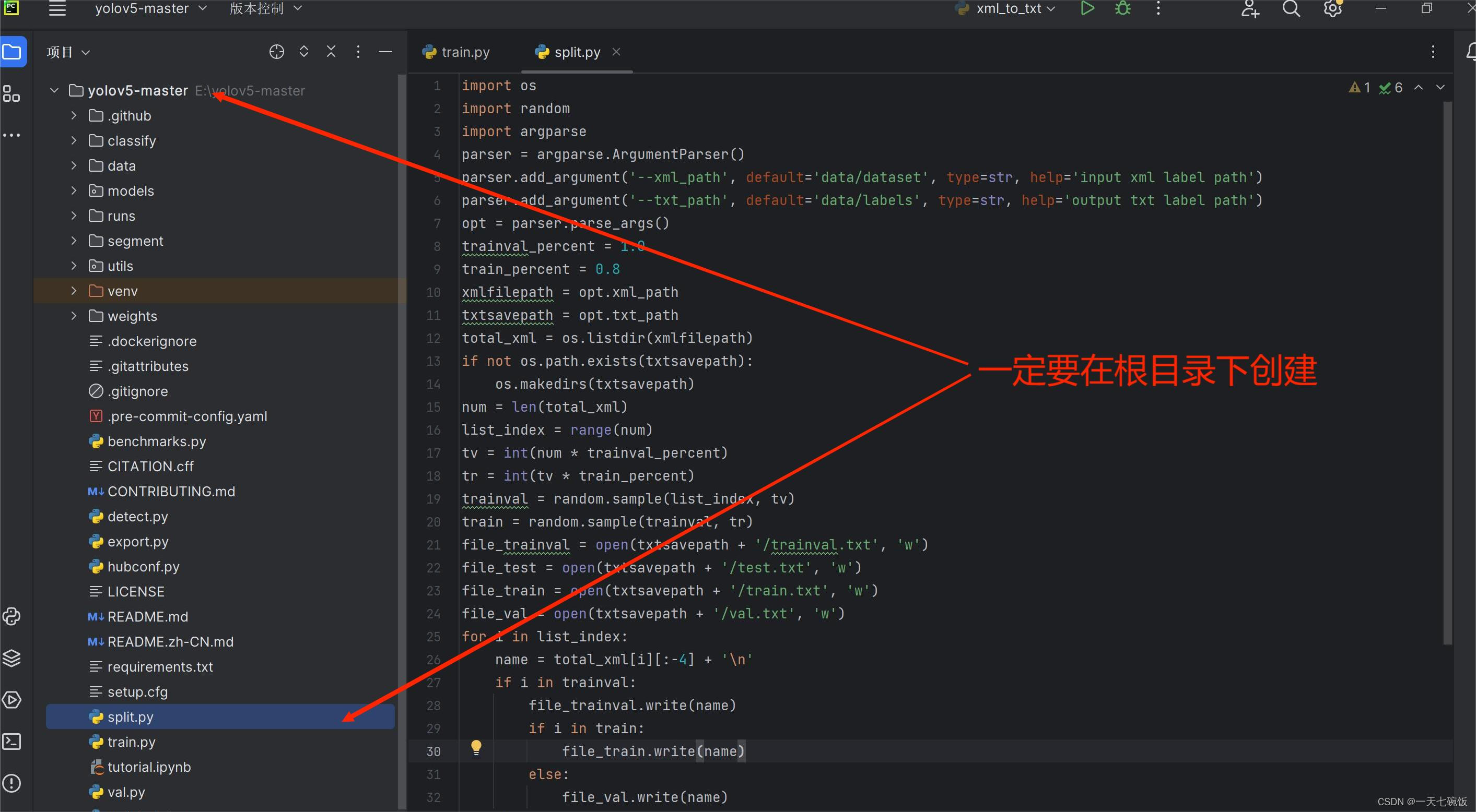 我们需要在yolov5工程目录下新建两个.py程序,split.py , xml_to_txt.py