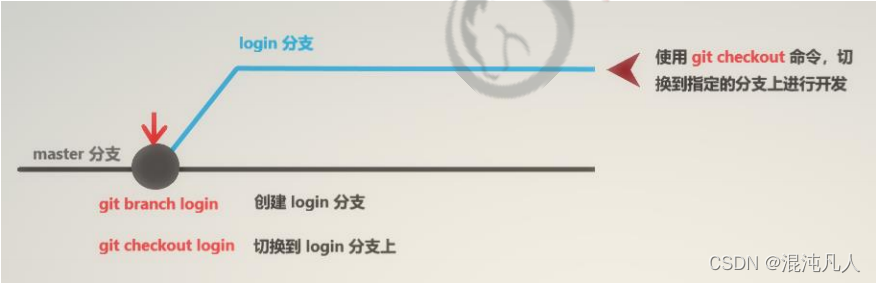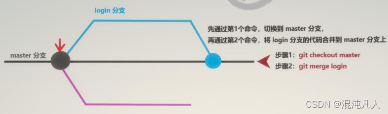 # 1. 切换到 master 分支 git checkout master # 2. 在master 分支上运行 git merge 命令,将 login 分支的代码合班到 master 分支 git merge login