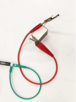 图2所示为电容连接图,连接线接上电容一边,另一边连接铜棒触碰电容,clip-around线圈套入连接线中,其中红色电容连接线可视为低阻抗路径。