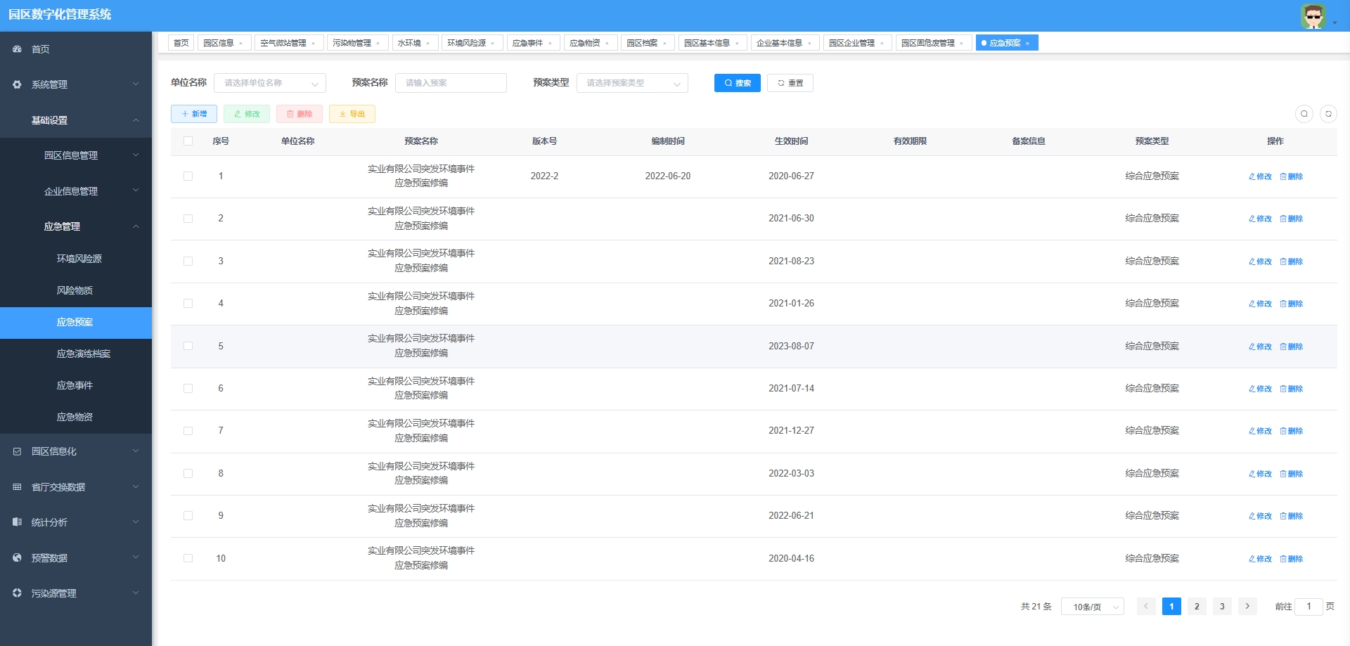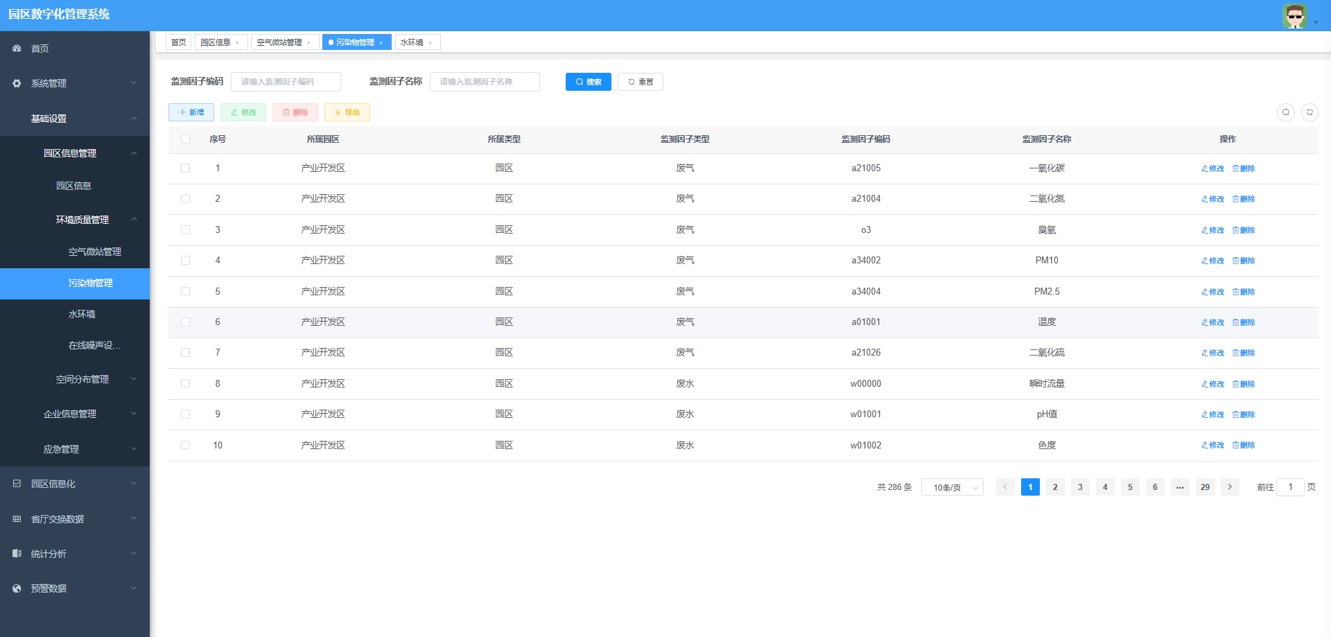 污染源信息管理:管理园区内污染源的详细信息。