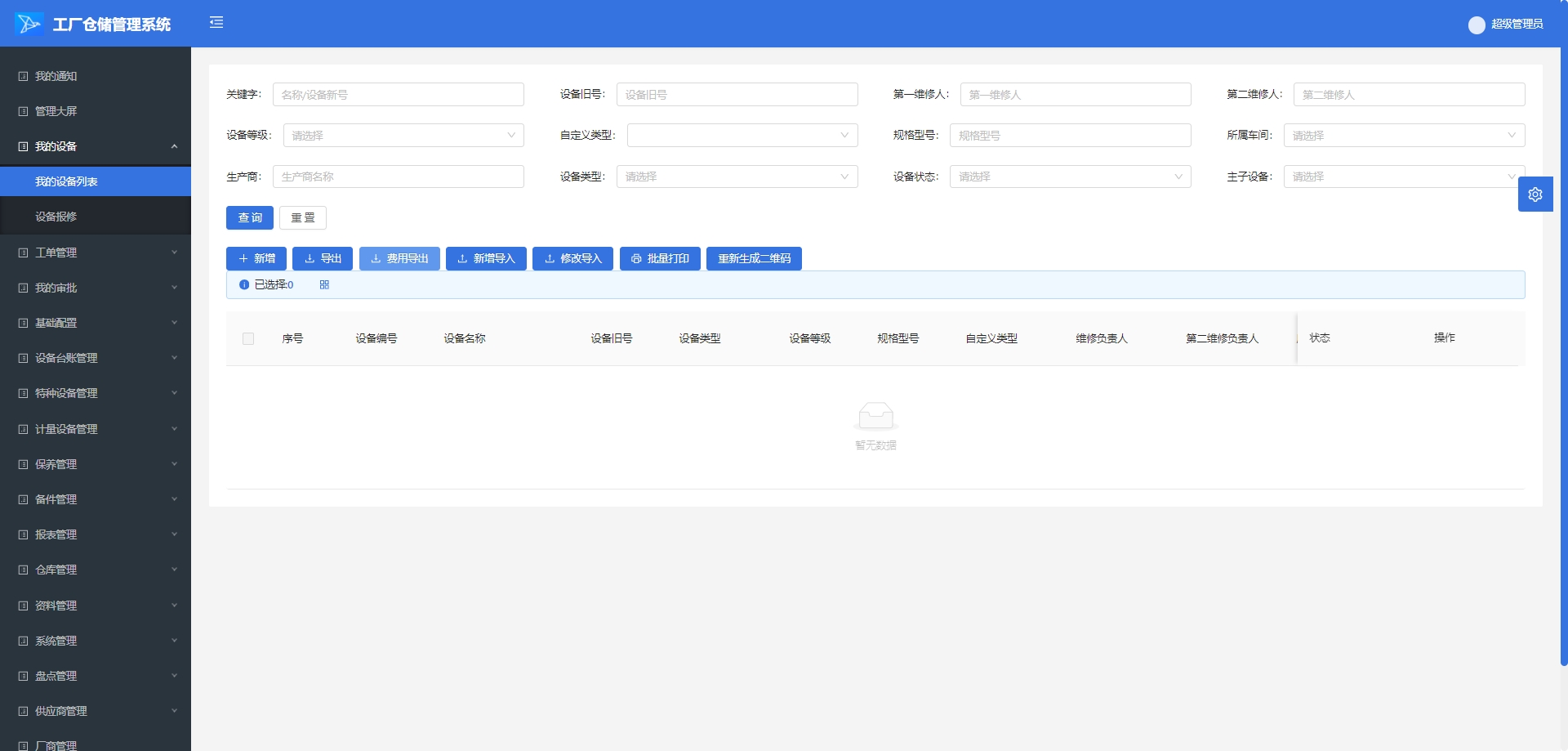 仓库存储管理系统-综合管理系统是一个全面覆盖仓储和物流业务流程的解决方案,旨在提高仓库管理的效率和准确性。系统通过我的通知、管理大屏、工单管理、基础配置、设备管理、计算设备管理、保养管理、备件管理、仓库管理、报表管理、资料管理、系统管理和供应商管理等多个模块,实现了从设备监控、工单处理、基础信息配置到仓库操作的全流程管理。