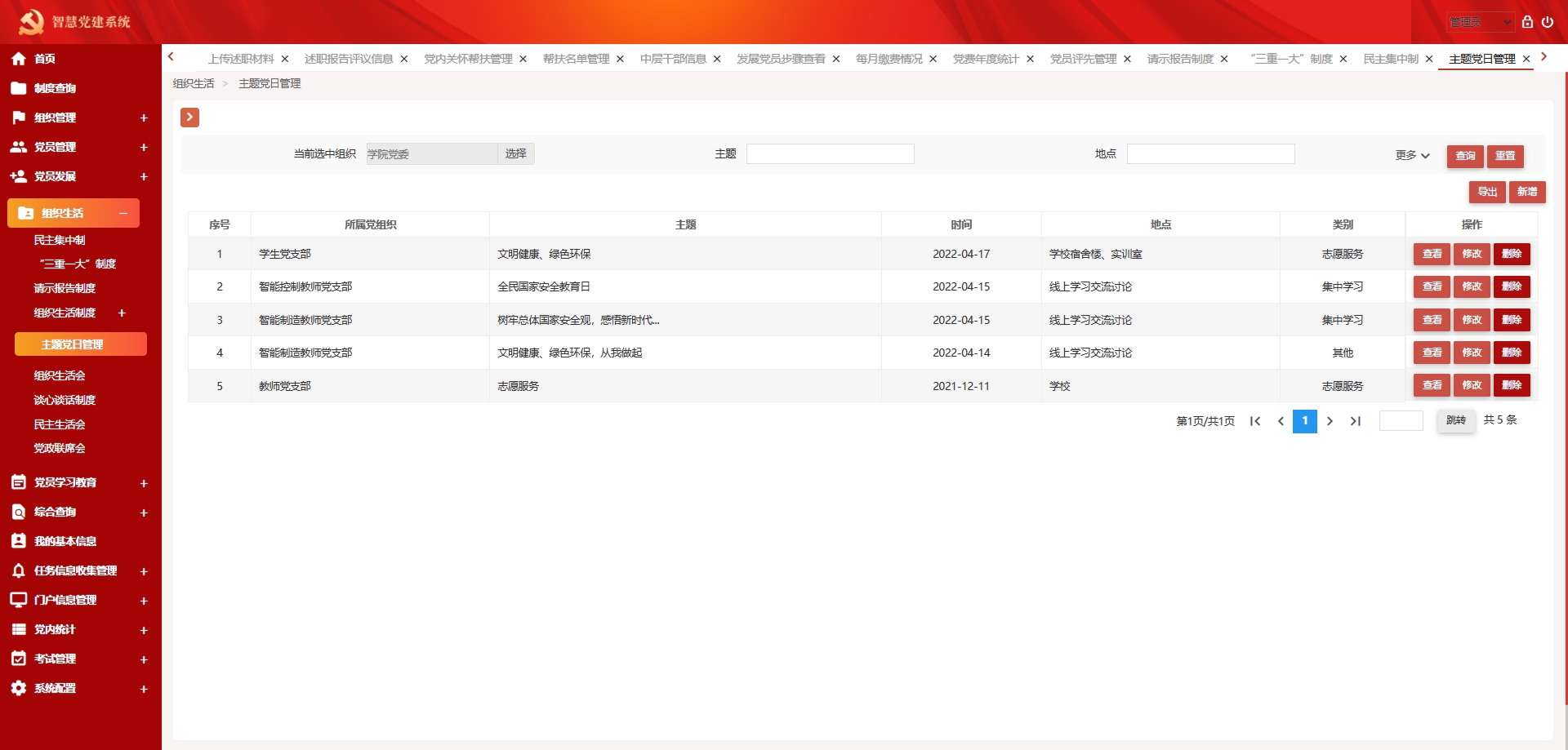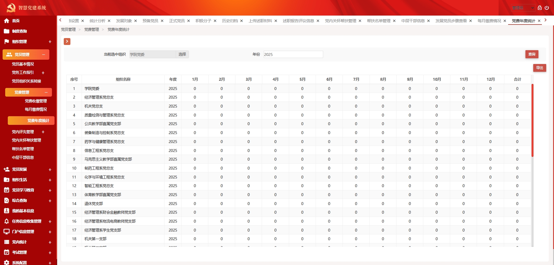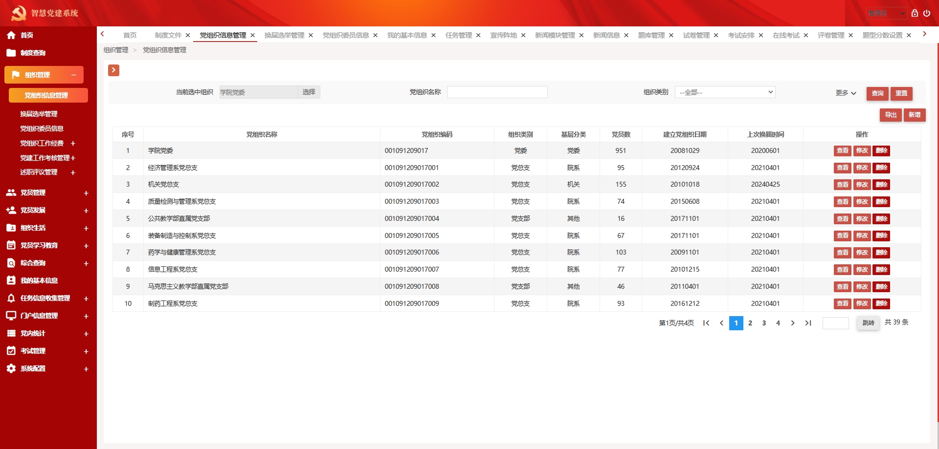 - 党组织信息管理:管理党组织的基本信息,如名称、成员和活动记录。
