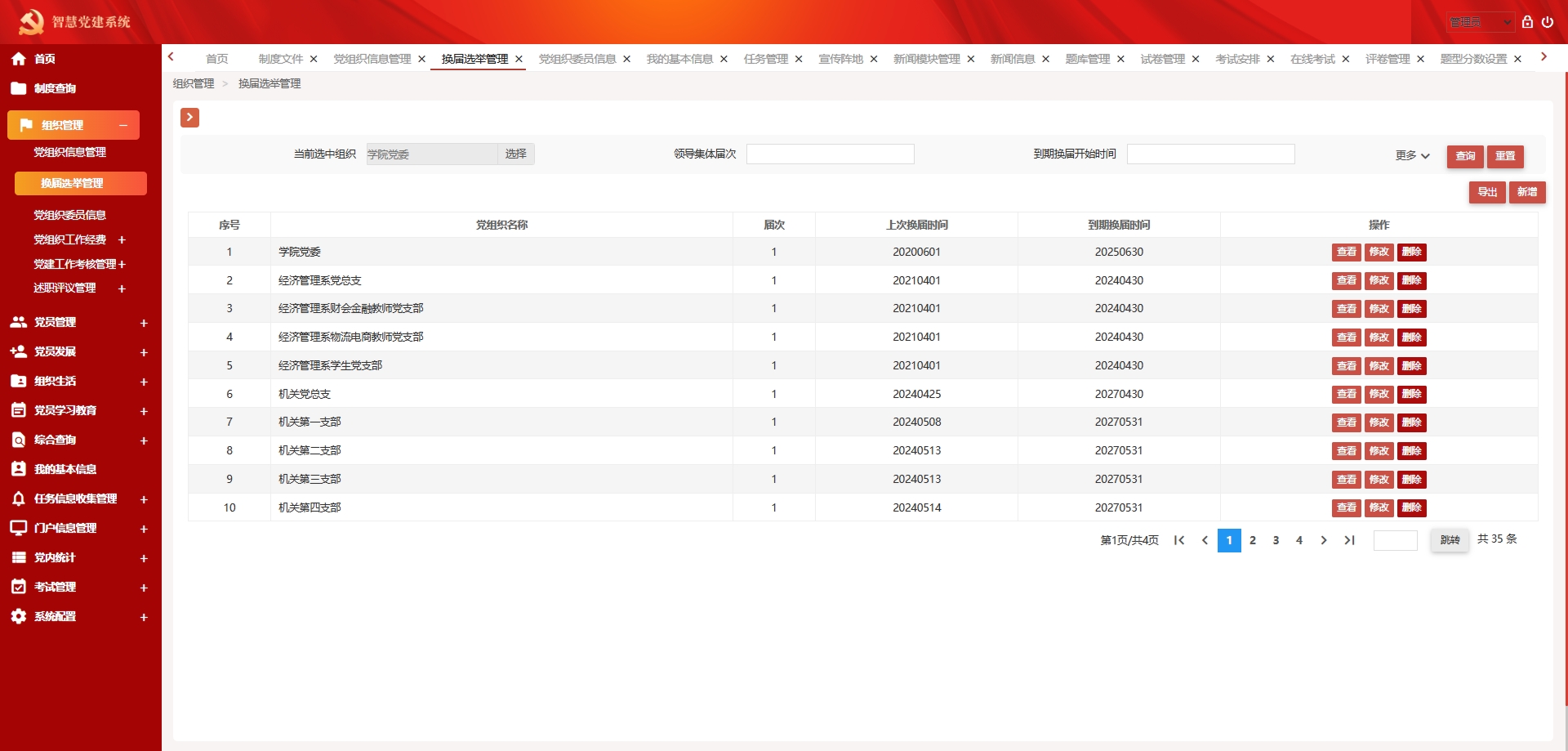 - 换届选举管理:管理党组织的换届选举流程,包括候选人提名、投票和结果公布。