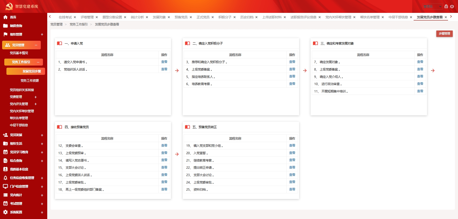 - 党务工作指引:展示党员发展的步骤和要求,包括入党申请、考察和审批流程。