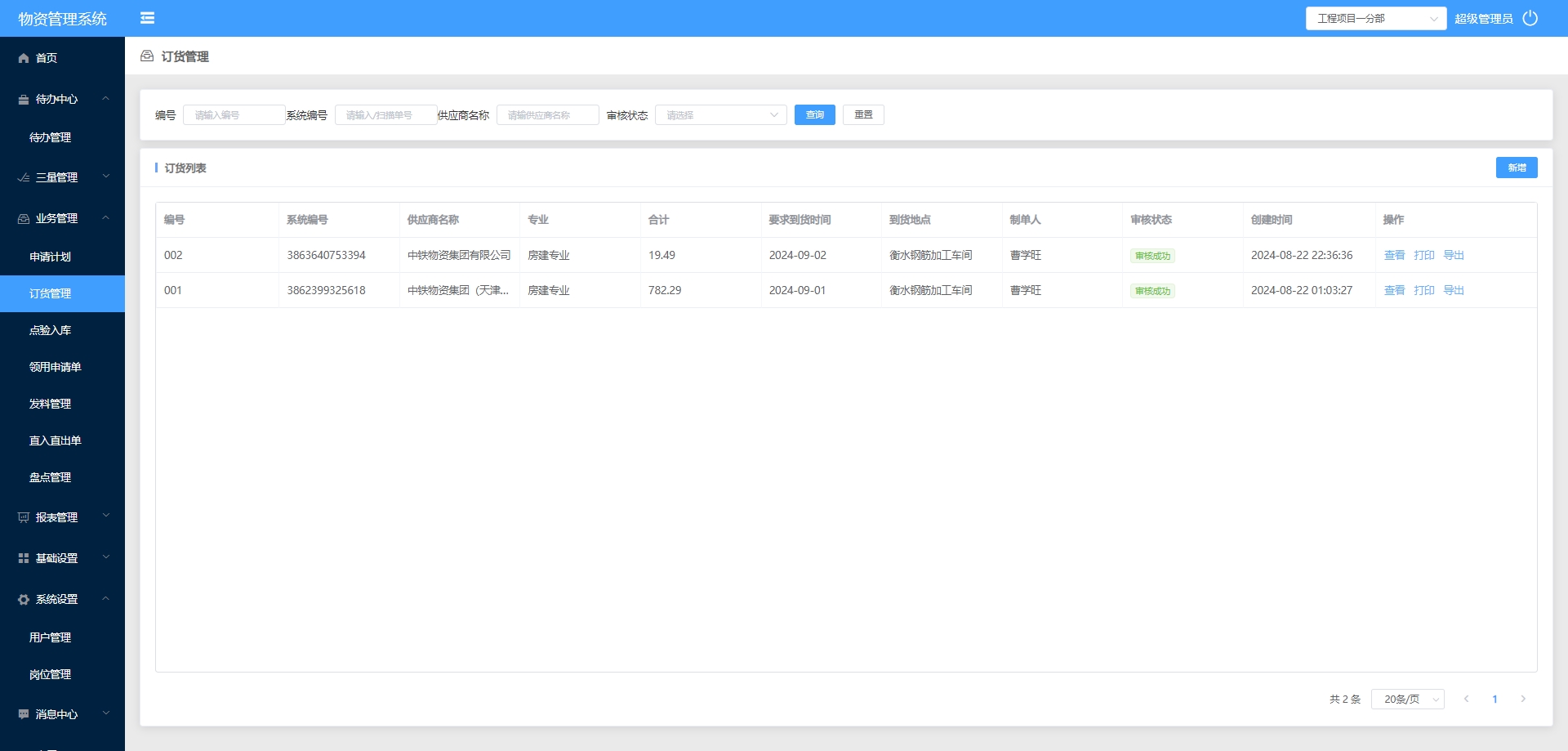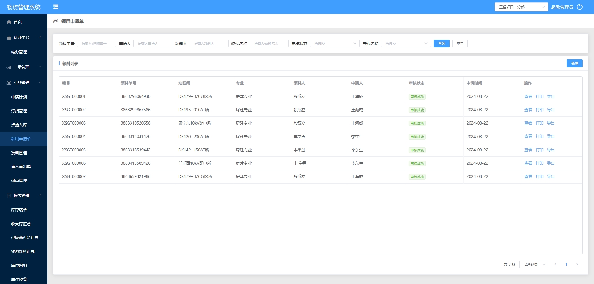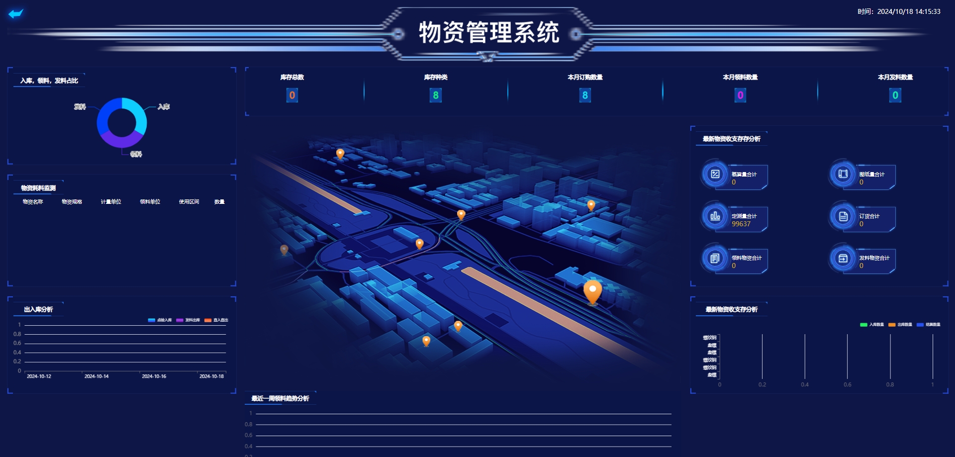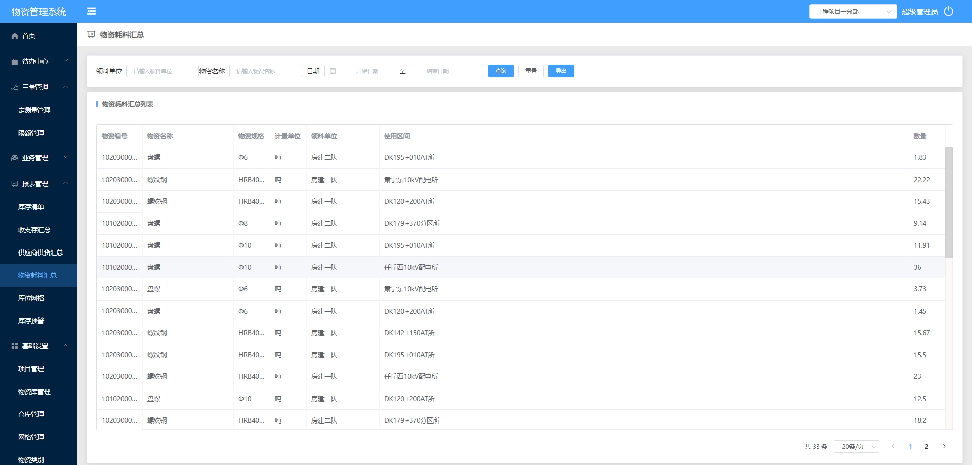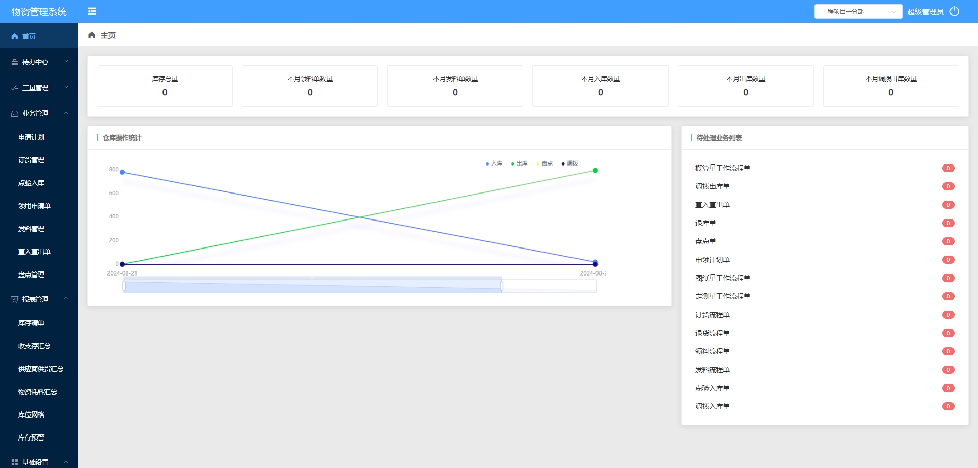 - 报表管理:提供库存预警、项目进度和物资库存等报表,支持决策分析。