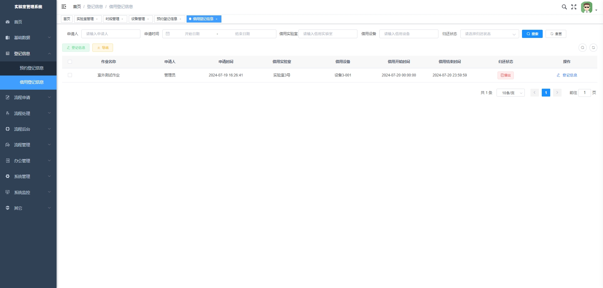 - 借用登记信息:记录实验室设备借用的详细信息,包括借用人、借用时间、设备详细和归还状态。
